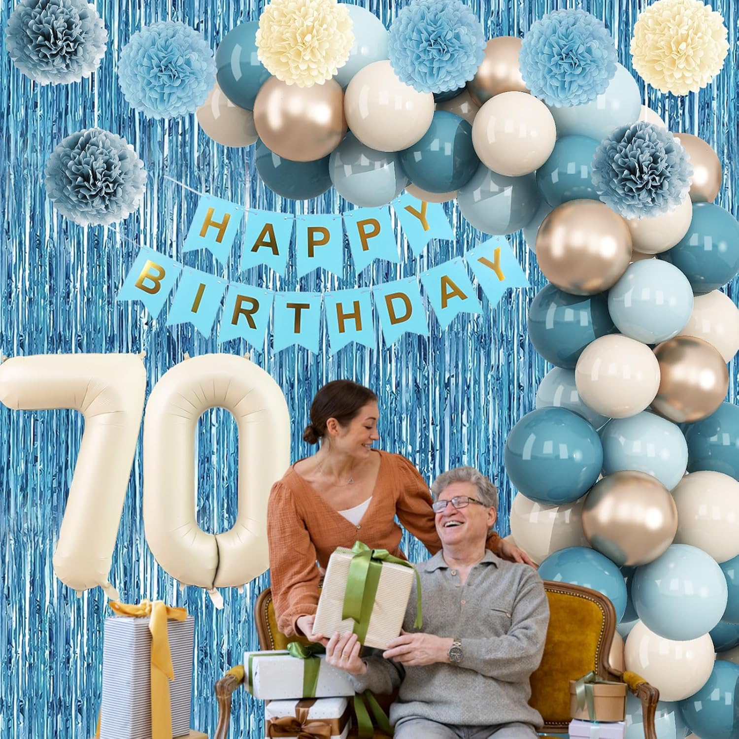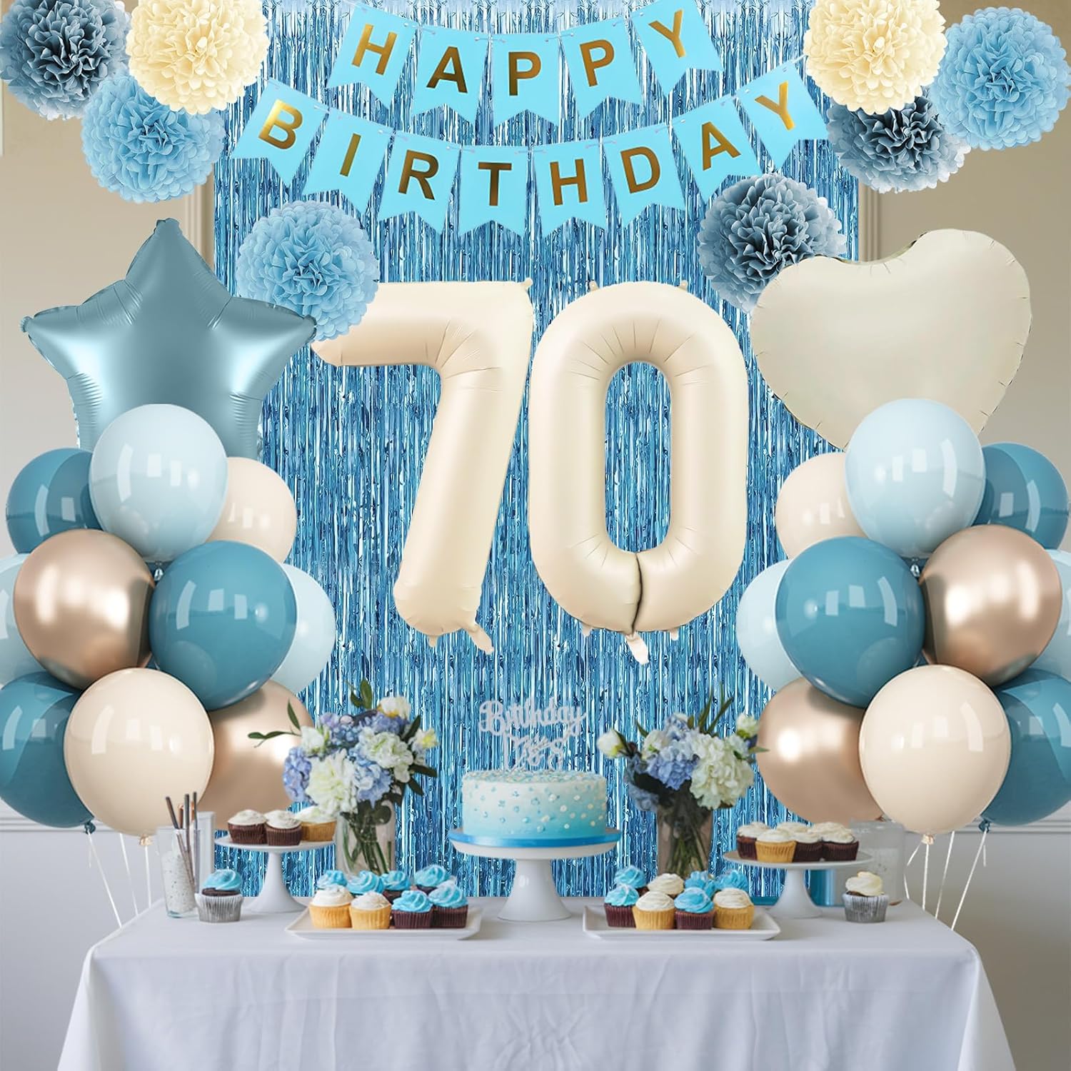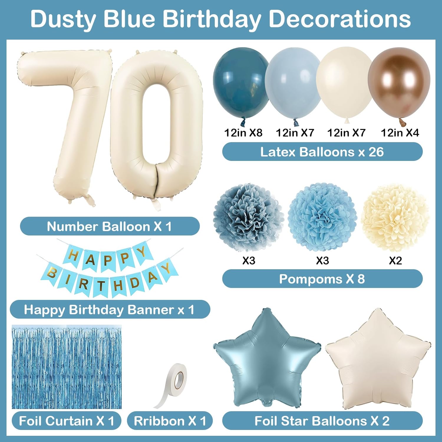 • PACKAGE INCLUDES: 1pc 70 number balloon, 1pc happy birthday banner, 3pcs light blue paper Pom Poms, 3pcs dusty blue paper pom poms, 3pcs nude paper pom poms, 1pc blue fringe curtain, 2pcs dusty blue star foil balloons, 8pcs dusty blue balloons, 7pcs fog blue balloons, 7pcs beige balloons, 4pcs champagne gold balloons, 1pc ribbon