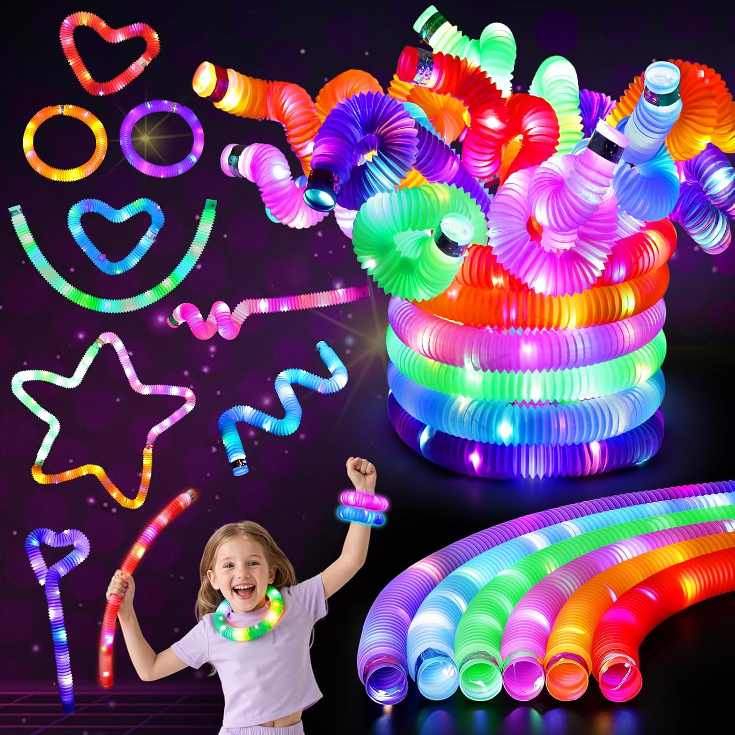 • Large Number of Glow Sticks - Retractable Design: Perfect for kids' events, festivals, and parties, this set includes 24 glow sticks in 6 vibrant colors. Each pop tube features 14 bright LED bulbs with 3 lighting modes: fast flash, slow flash, and steady light, creating a captivating glow. When stretched, each tube extends to 25 inches, while its size is 7.5 x 1.2 inches before stretching