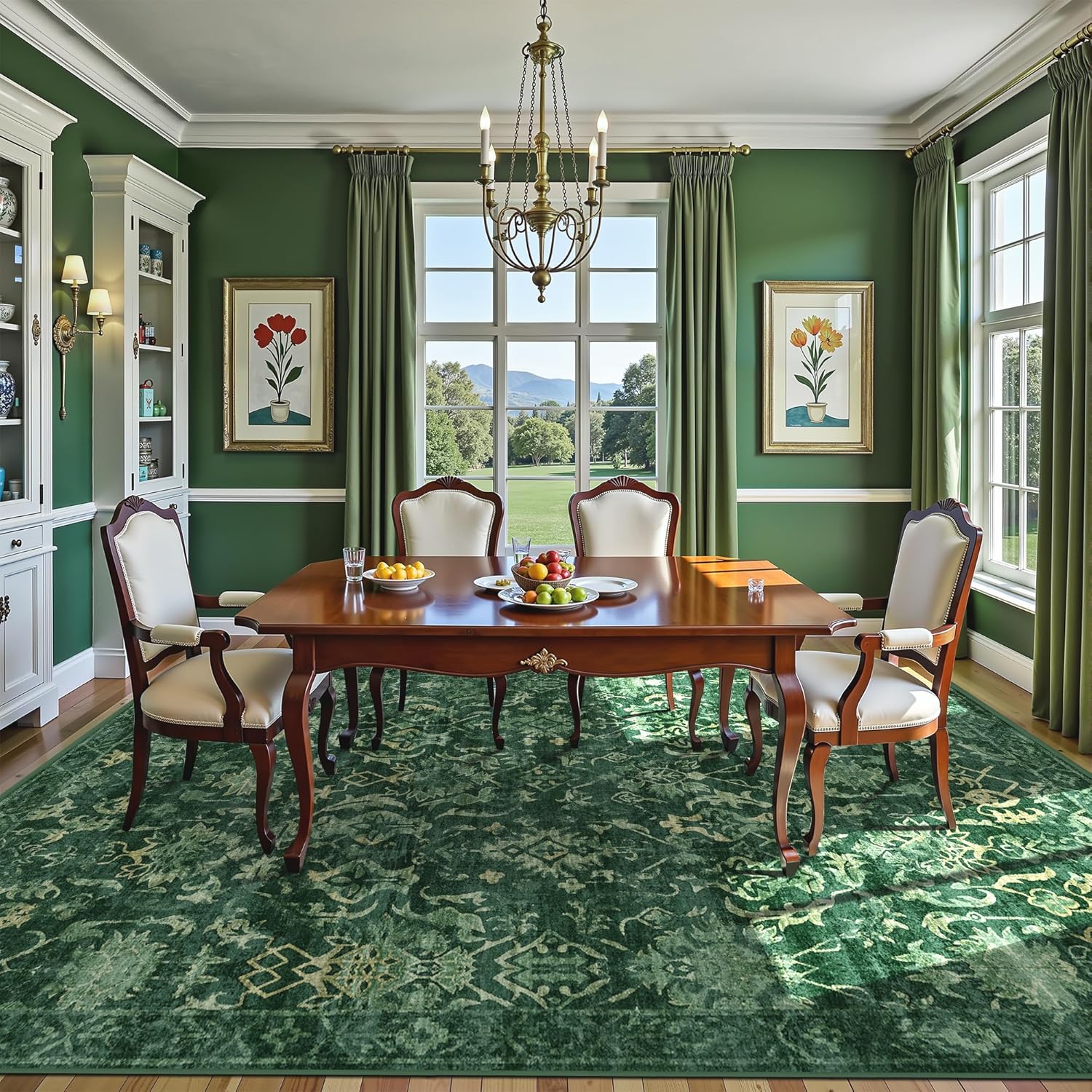 Dark Green Extra Large Area Rug 10x14 for Living Room, Distressed Washable Rug for Dining Room Bedroom, Anti-Slip Low-Pile and Soft Accent Rug Farmhouse Office Home Decor Light Green
