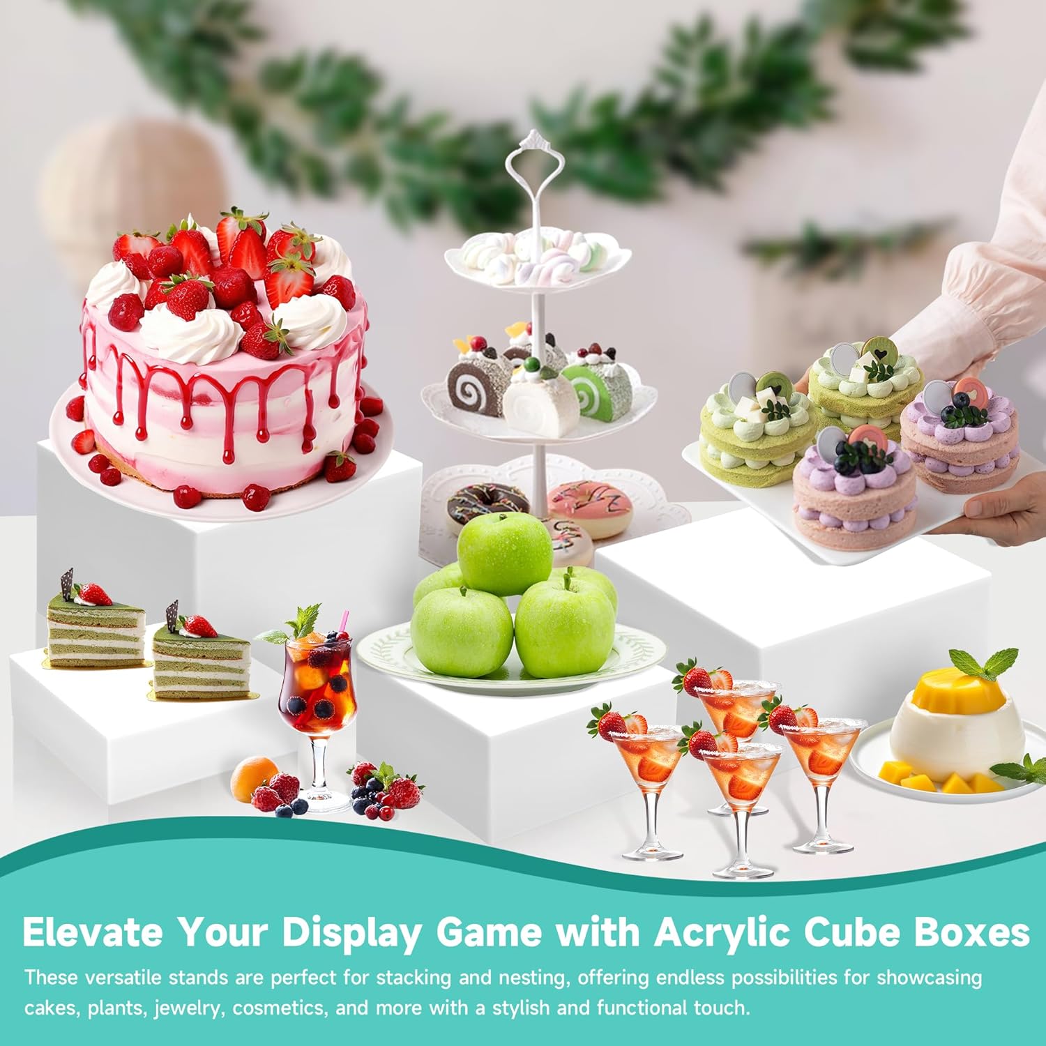 • Elevate Your Display Game with Acrylic Cube Boxes: These versatile stands are perfect for stacking and nesting, offering endless possibilities for showcasing cakes, plants, jewelry, cosmetics, and more with a stylish and functional touch.