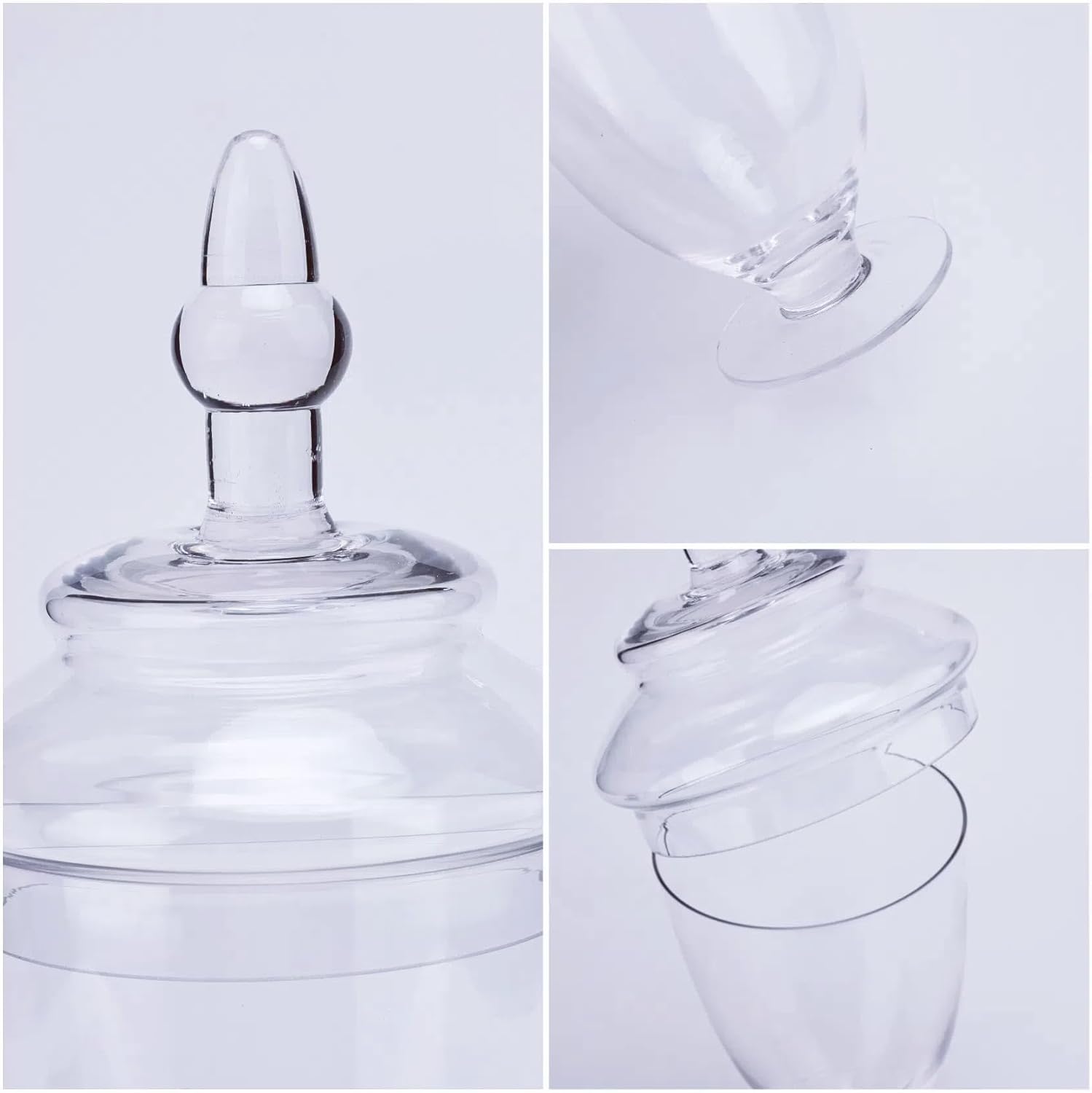 • DIFFERENT SIZES: This set of 3 apothecary jar glass includes 3 beautiful candy glass jars with lids in varying shapes and sizes. The size of the candy jars for candy buffet are approximately (with lids) 8.4" (H) x 4.5" (D), 8.4" (H) x 4.4" (D), 10.5" (H) x 4.4 "(D). Their capacities are 20 ounces, 23 ounces, and 28 ounces, respectively.
