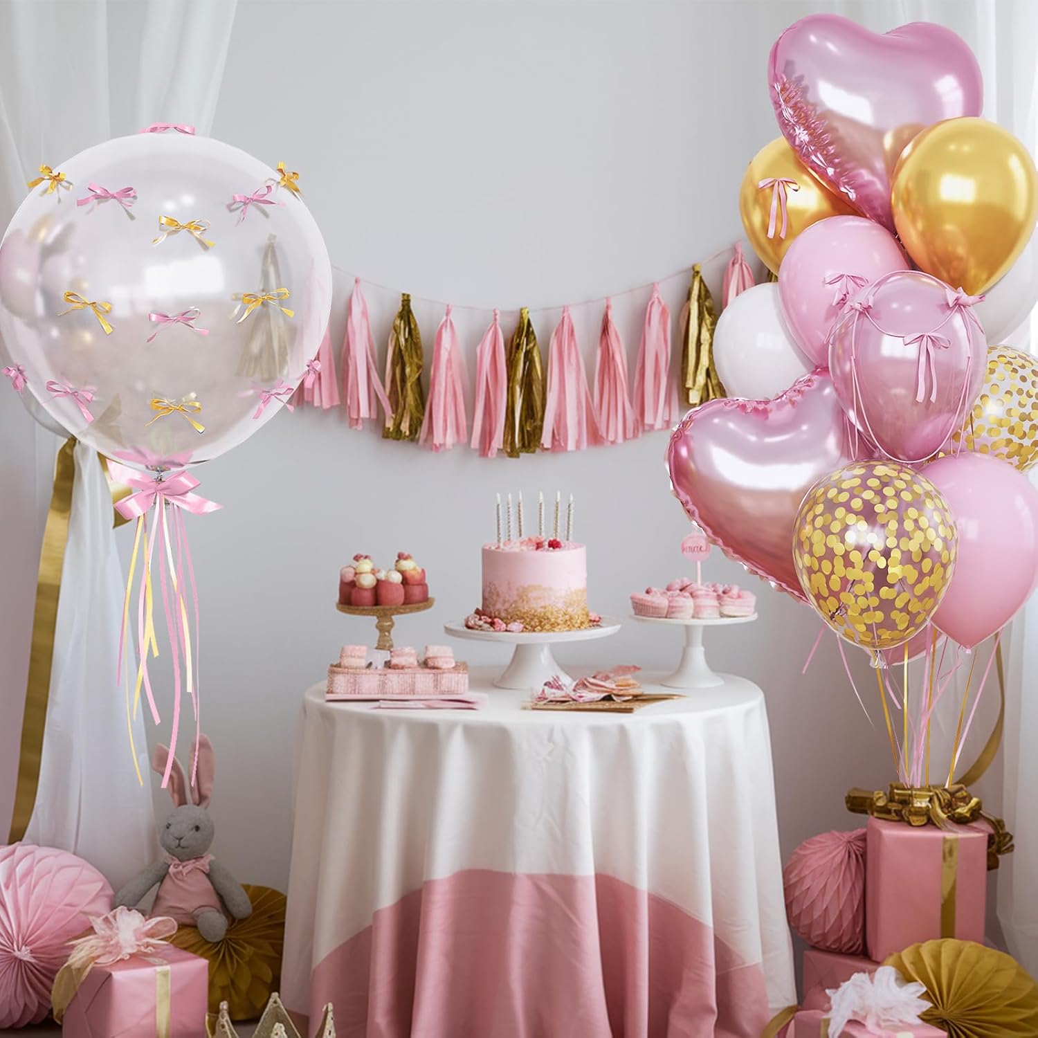 • πŸ₯³γ€Pink Gold Heart Balloon Set - Exquisite Party Decoration】: Pink Heart-Shaped Foil Balloons (18-in x 4), Transparent Balloon (18-in x 1), Metallic Gold Balloons (12-in x 4), Macaron Pink Balloons (12-in x 4), Gold Confetti Balloons (12-in x 4), Pearl Light Pink Balloons (12-in x 4), White Balloons (12-in x 4), πŸŽ€ Gold Ribbon (10M x 1), πŸŽ€ Pink Ribbon (10M x 1). Exclusive color matching by the stylist, featuring a soft and elegant pink-gold palette.