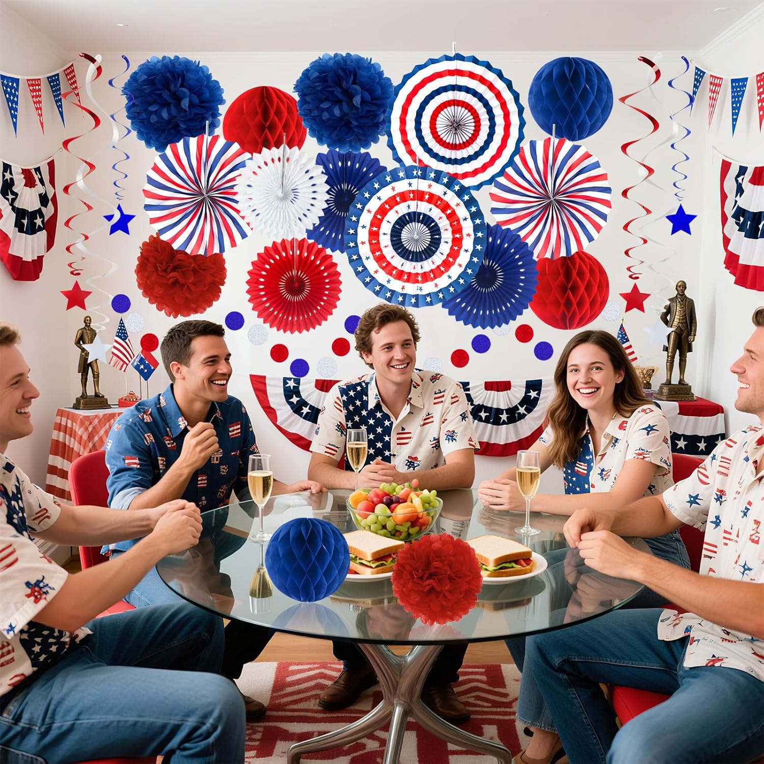 24PCS Patriotic Decorations 4th of July Decorations Set Red White Blue Hanging Paper Fans USA Flag Pennant Pom Poms Hanging Swirls Party Supplies for Memorial Day Independence Veterans