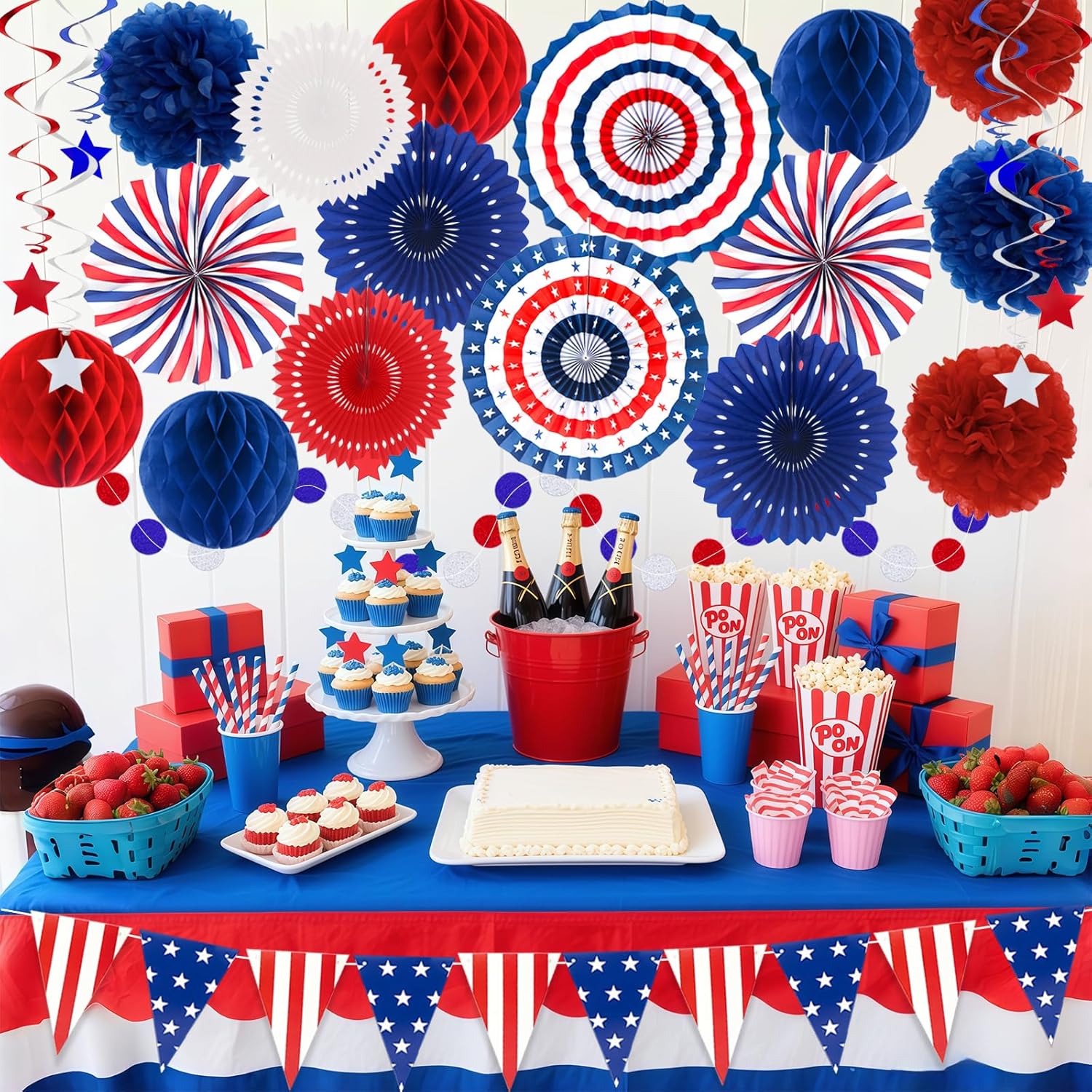 • [Package contains]: Red white and blue party decorations with 8PCS patriotic hanging paper fans in diffrent size, 1PCS 8.2ft triangle flag banner, 2PCS red + 2PCS blue + 2PCS white hanging swirls star, 4PCS 8in honeycomb balls, 4PCS 8in paper pom poms flowers, 1PCS 6.5ft circle banner. The color combination is very unique.