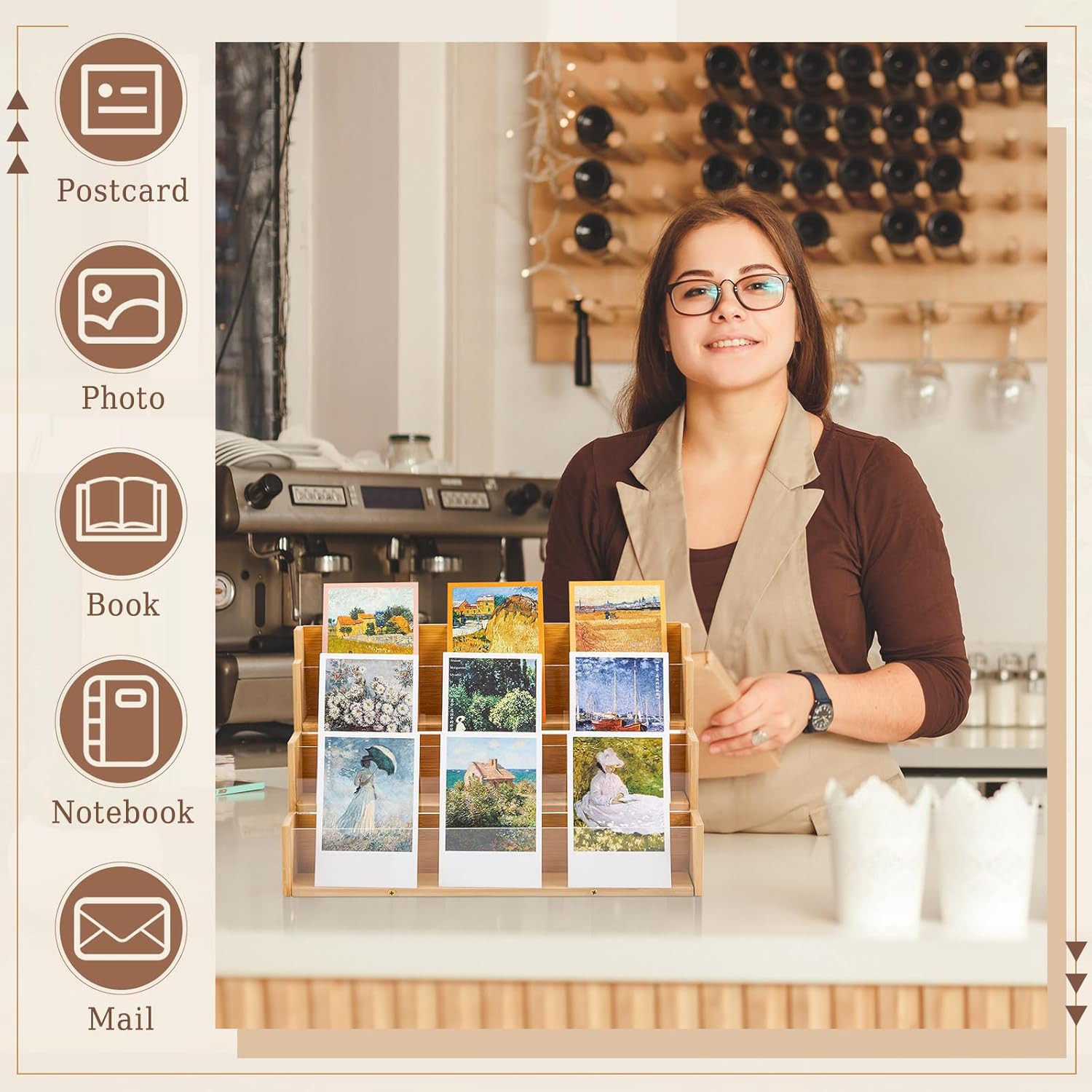 • Elegantly Crafted Design: dive into the modern design with our greeting card display rack; Made with a blend of bamboo wood boards and acrylic panels, the construction provides both stability and a full showcase of your distinct items