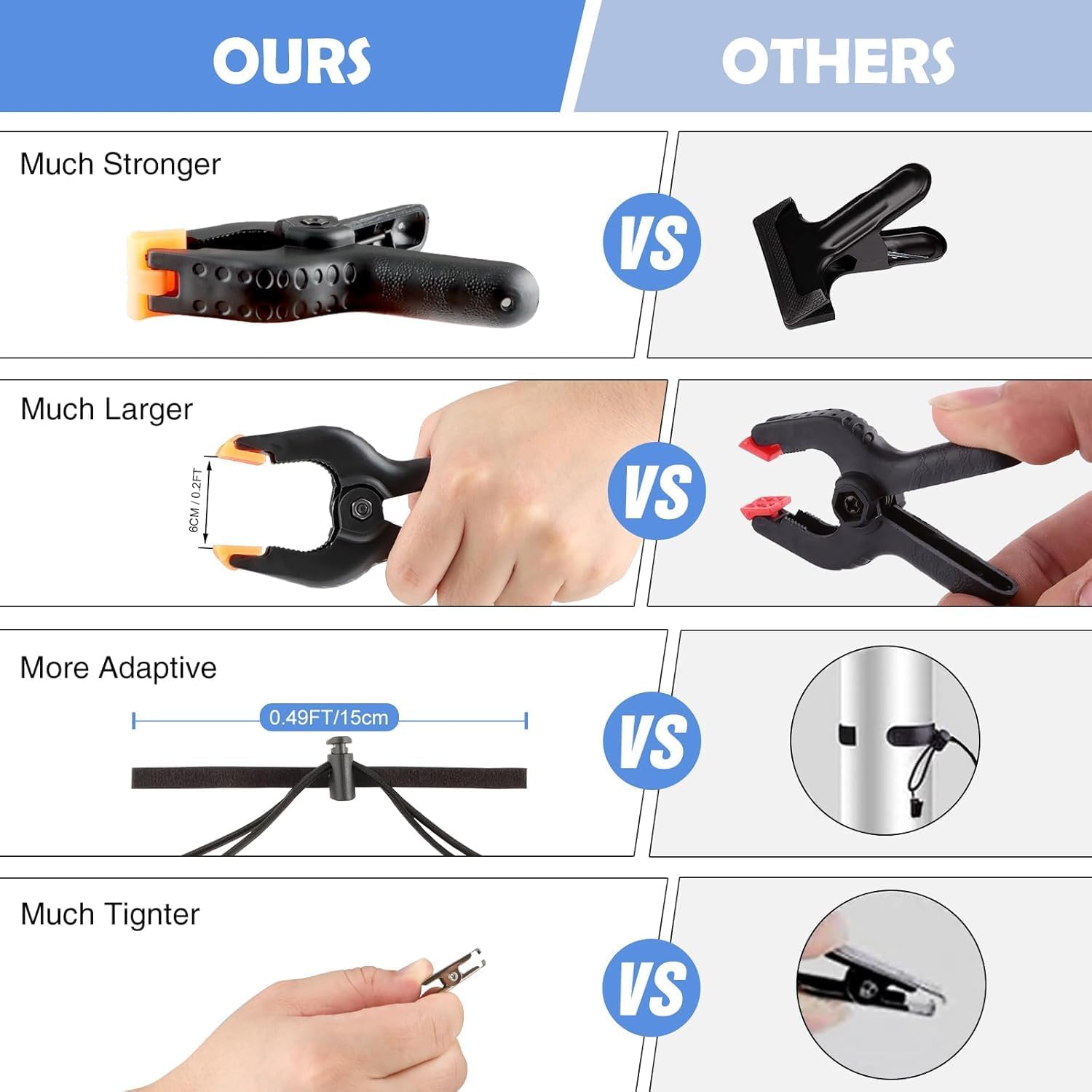 • 【PACKAGE CONTENT】: 6 pcs Heavy Duty Spring Clamps, 6 pcs Backdrop Clips. The spring clip can firmly fix the photographic fabric on the background fabric holder to prevent the background fabric from slipping. The backdrop clamp clip holds the background fabric tight and reduces creasing