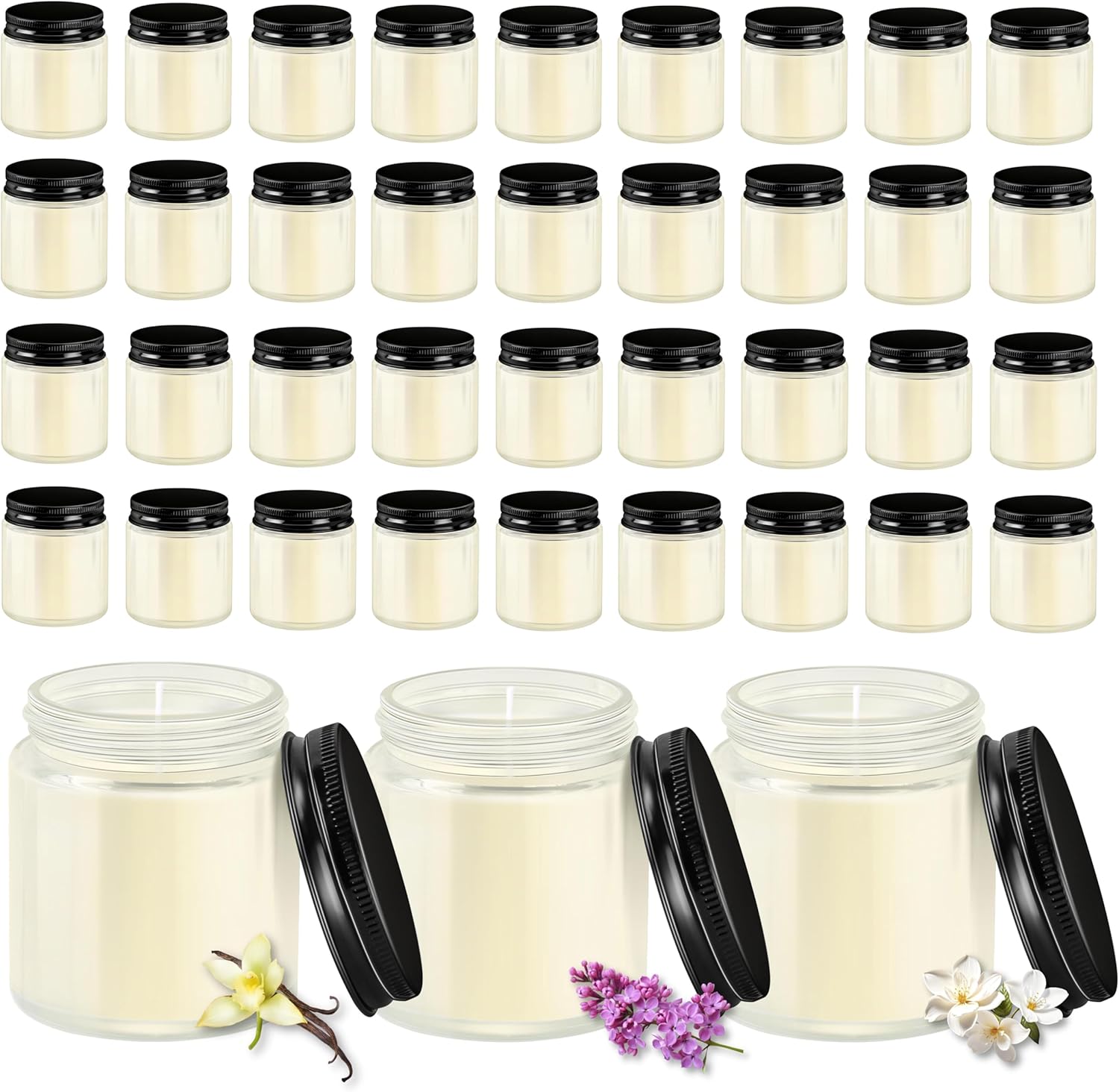• Product Contents: 36 candles (4 oz each) in glass jars with black lids, including 12 Vanilla, 12 Lilac, and 12 Gardenia-scented candles.