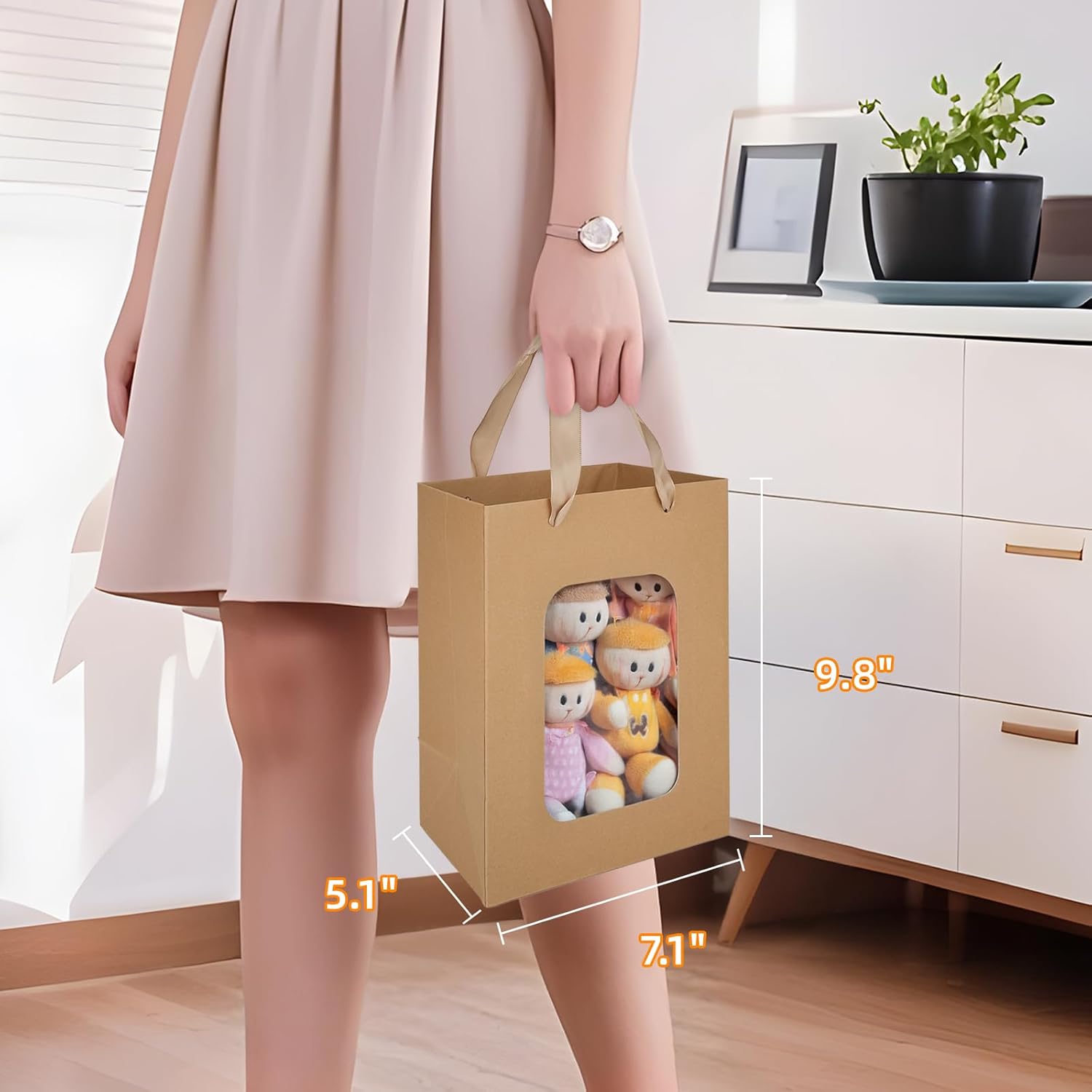 MOXARYSU 6 Pcs Brown Gift Bags with Clear Window: 9.8x5.1x7.1 Inch Medium Kraft Paper Bags with Handle For Party Business Birthday Wedding