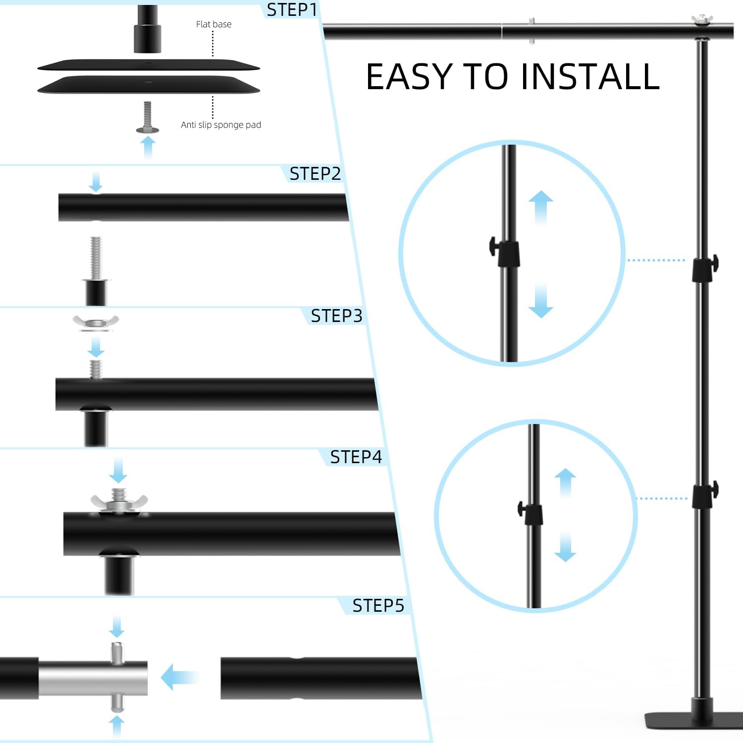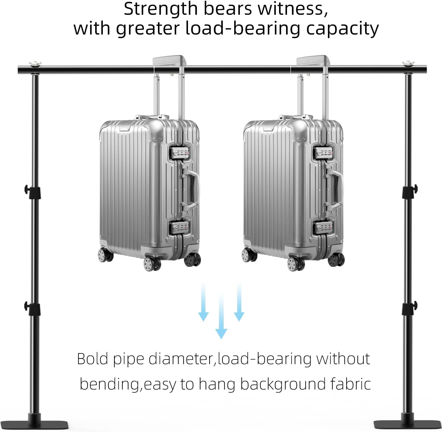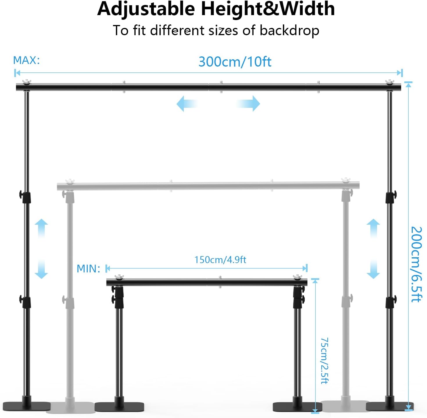 • 【Adjustable Telescopic Backdrop Stand】The backdrop stand is designed as a 4 section crossbar, making it more flexible in use. The Min. Width: 5ft (2 PCS crossbar), the Max. Width: 10ft (4 PCS crossbar). You can adjust to the appropriate width to fit different sizes of backdrop. And the height is adjustable from 2.7 ft to 10 ft.