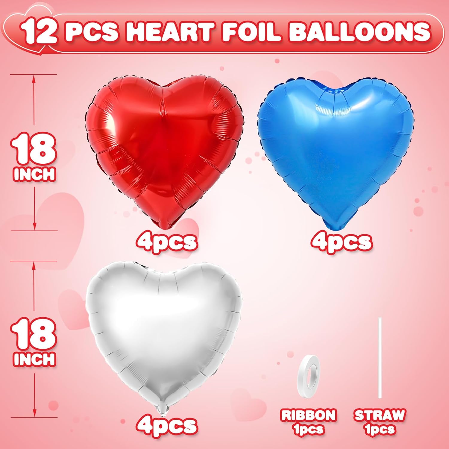 • 12PCS HEART BALLOONS:Package include 4pcs blue heart foil balloons,4pcs red foil balloons,4pcs silver heart foil balloons,1pc straw.Large enough to help you better decorate your party.