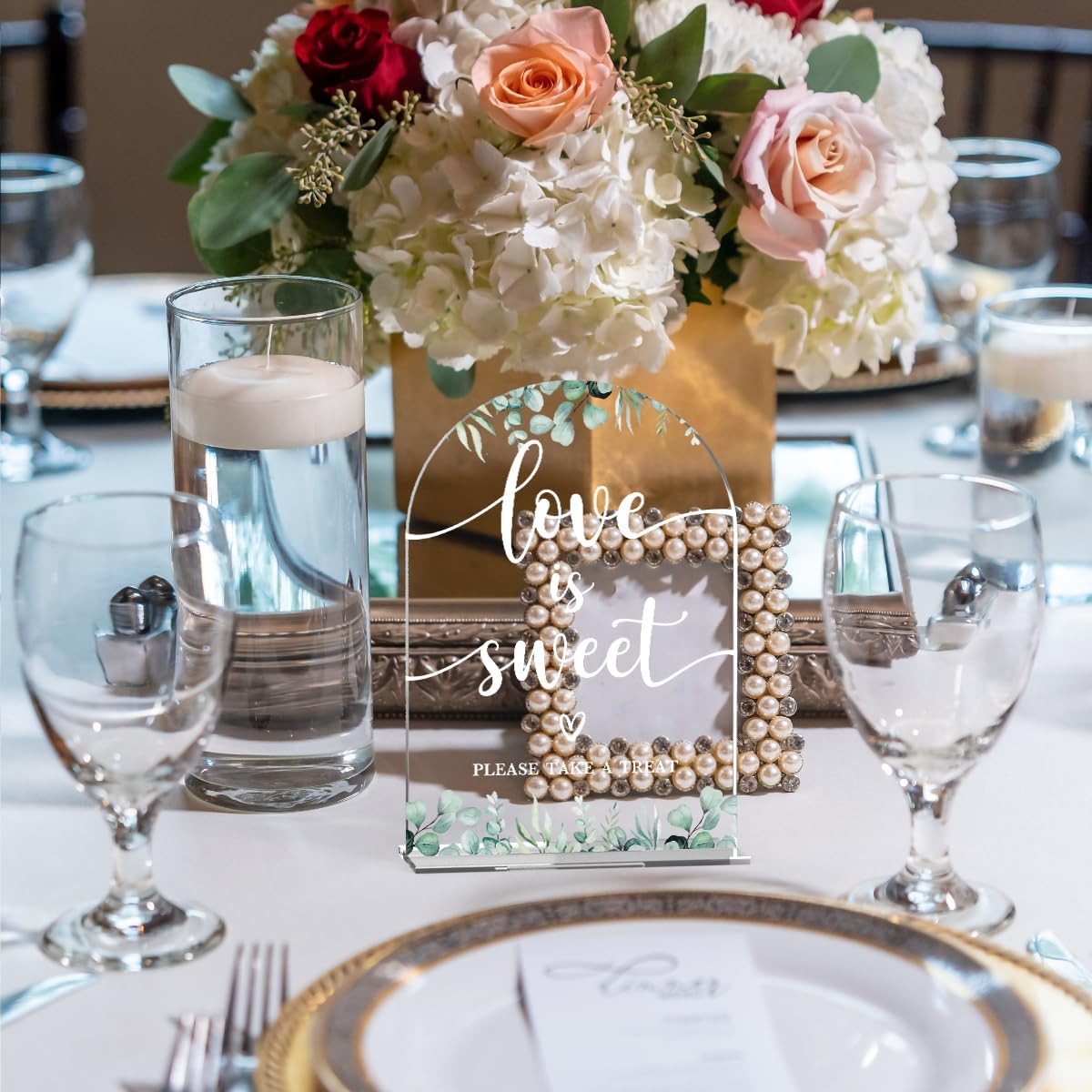 Acrylic Wedding Sign Love is Sweet Signs for Ceremony Modern Calligraphy Arch Acrylic Table Top Signs for Wedding Reception and Event Party Table Decor (Eucalyptus Leaves)