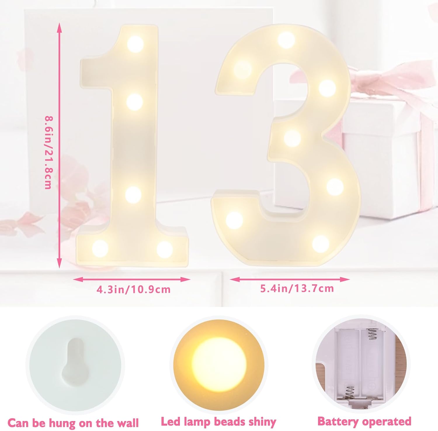• 【Light Up Your Birthday】 Light up number lights are great birthday party supplies and decorations, perfect for all kinds of scenes and memorable moments. Light up your birthday party by spelling out “13” with our number lights, light up the wonderful moments, warm white lights create a cozy atmosphere, make your 13th birthday party more memorable and sparkling!