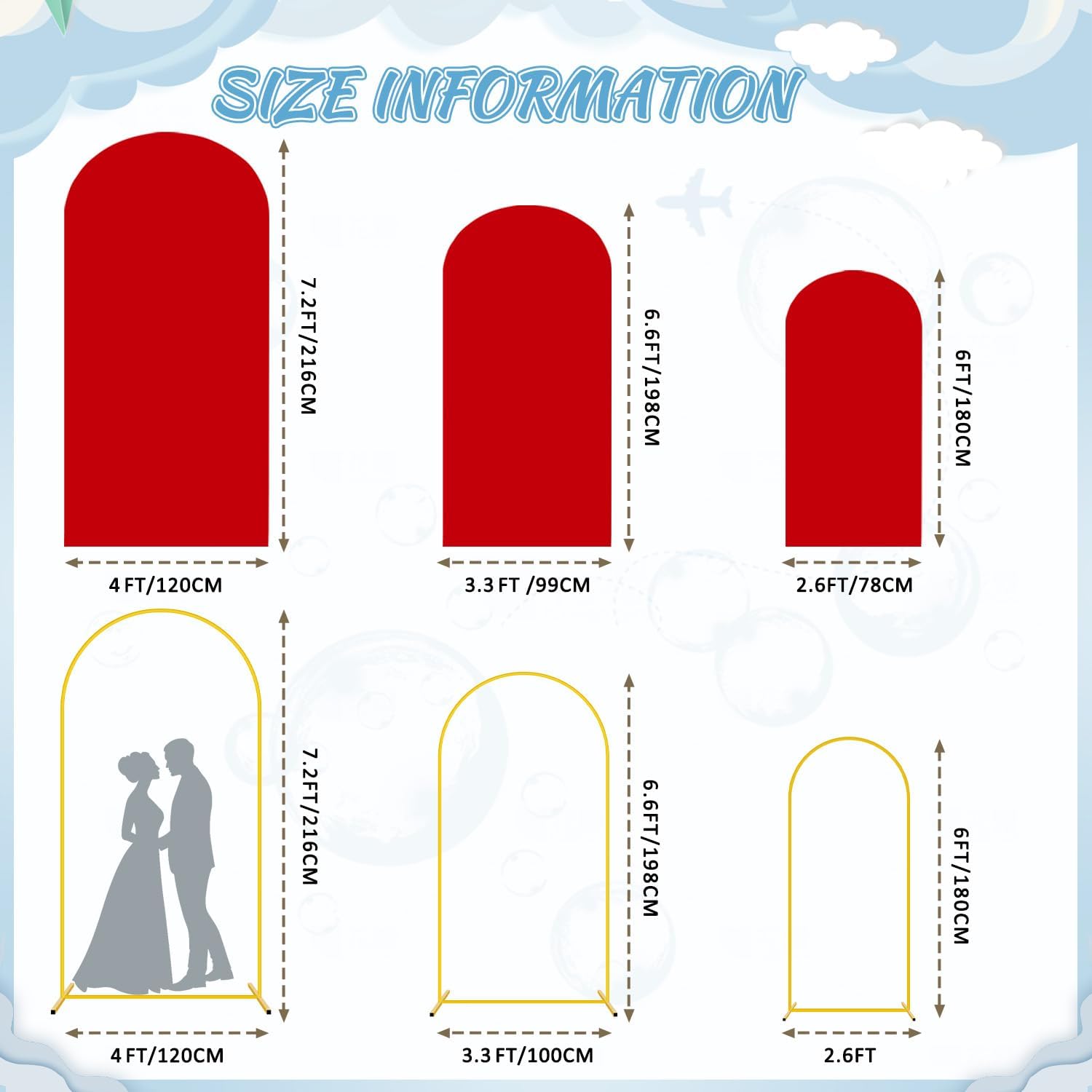 • ๐Ÿงธใ€Size Information- Arch Stand and Cover Setใ€‘Arch stand and cover set includes 3 gold metal arch backdrop stands and 3 red arch cover in sizes 7.2FT x 4FT(H x W), 6.6FT x 3.3FT(H x W) and 6FT x 2.6FT(H x W). The backdrop arch stand with cover is certain to meet your decoration needs and add a charming look to your celebrations.