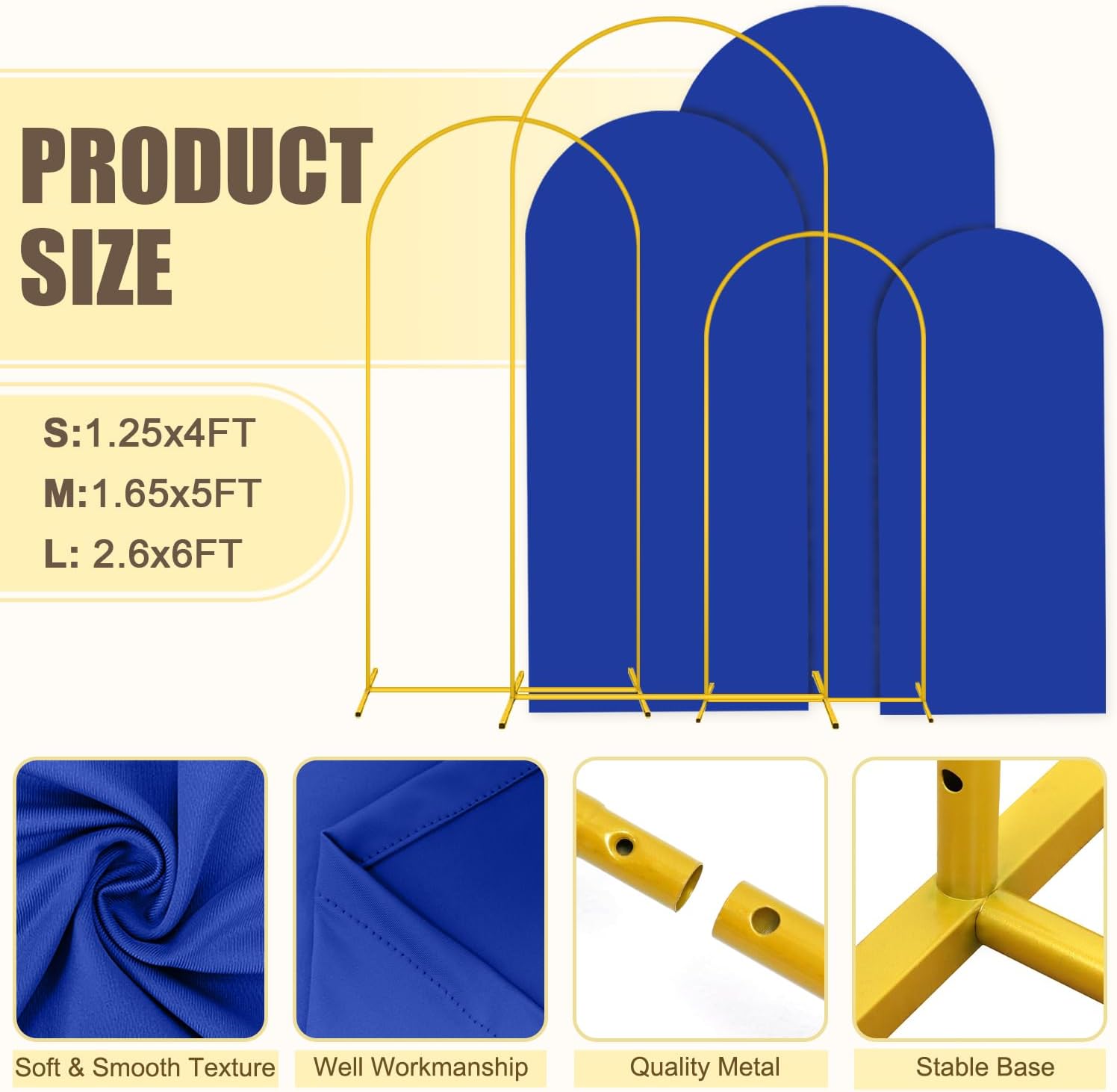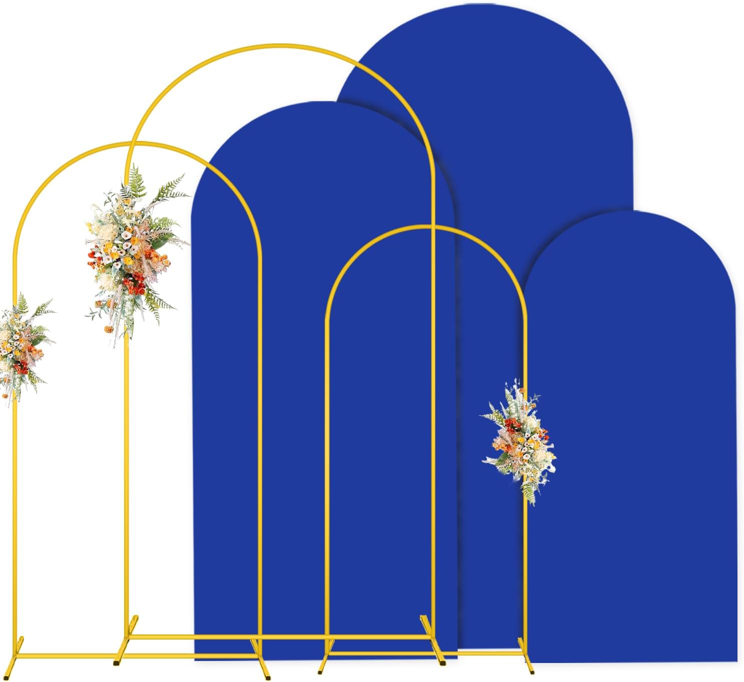 MODFUNS Arch Backdrop Stand and Cover Set 4&5&6ft Gold Arch Stand Royal Blue Arches Backdrop Cover Metal Weddding Arched Frame with Covers for Wedding Party Baby Shower Event Decor
