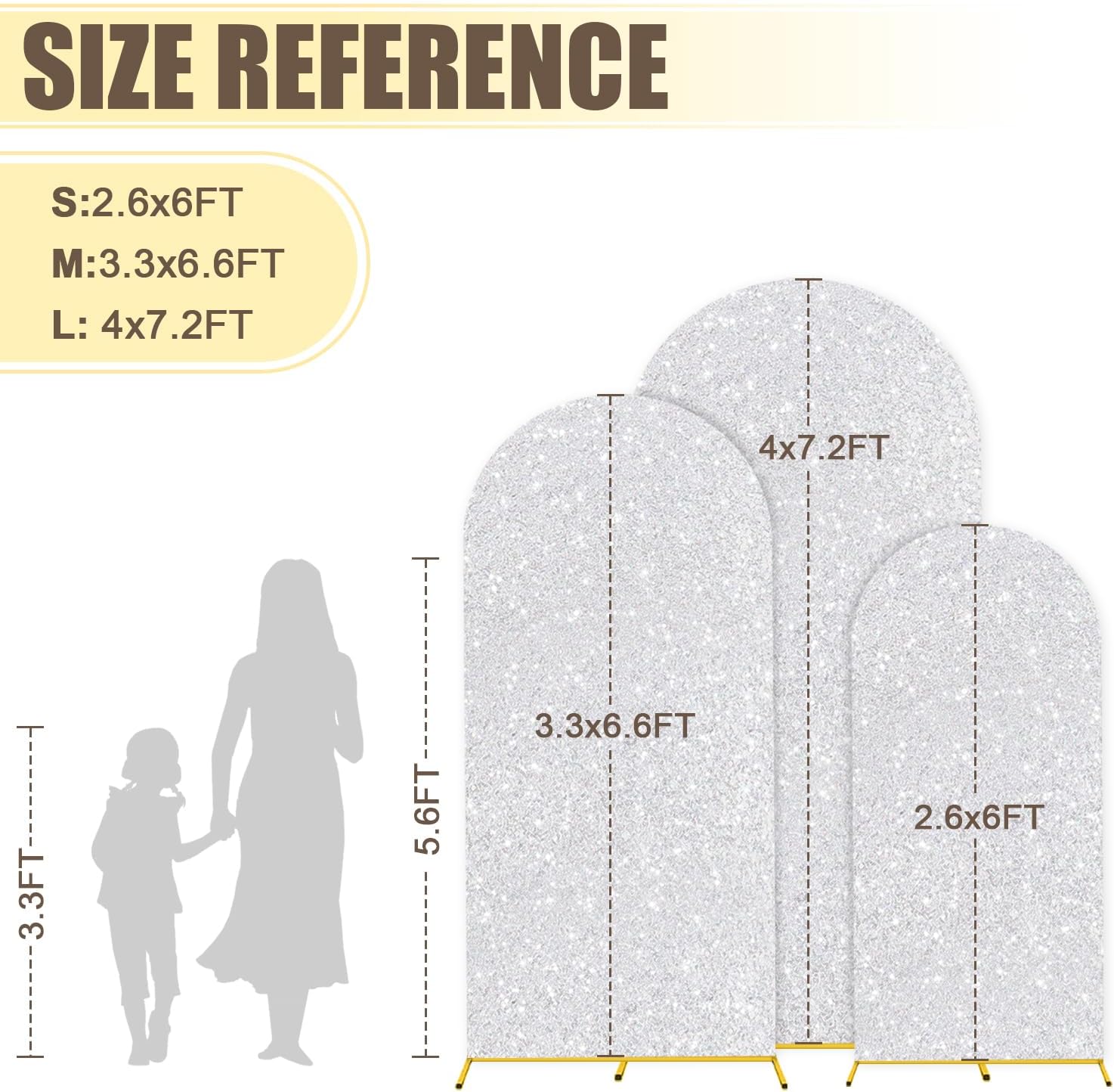 MODFUNS Arch Backdrop Stand and Cover Set 6&6.6&7.2ft Silver Sequins Arch Covers Set of 3 Gold Arched Backdrop Stands Chiara Arches Cover for Party Baby Shower Banquet Wedding Decoration