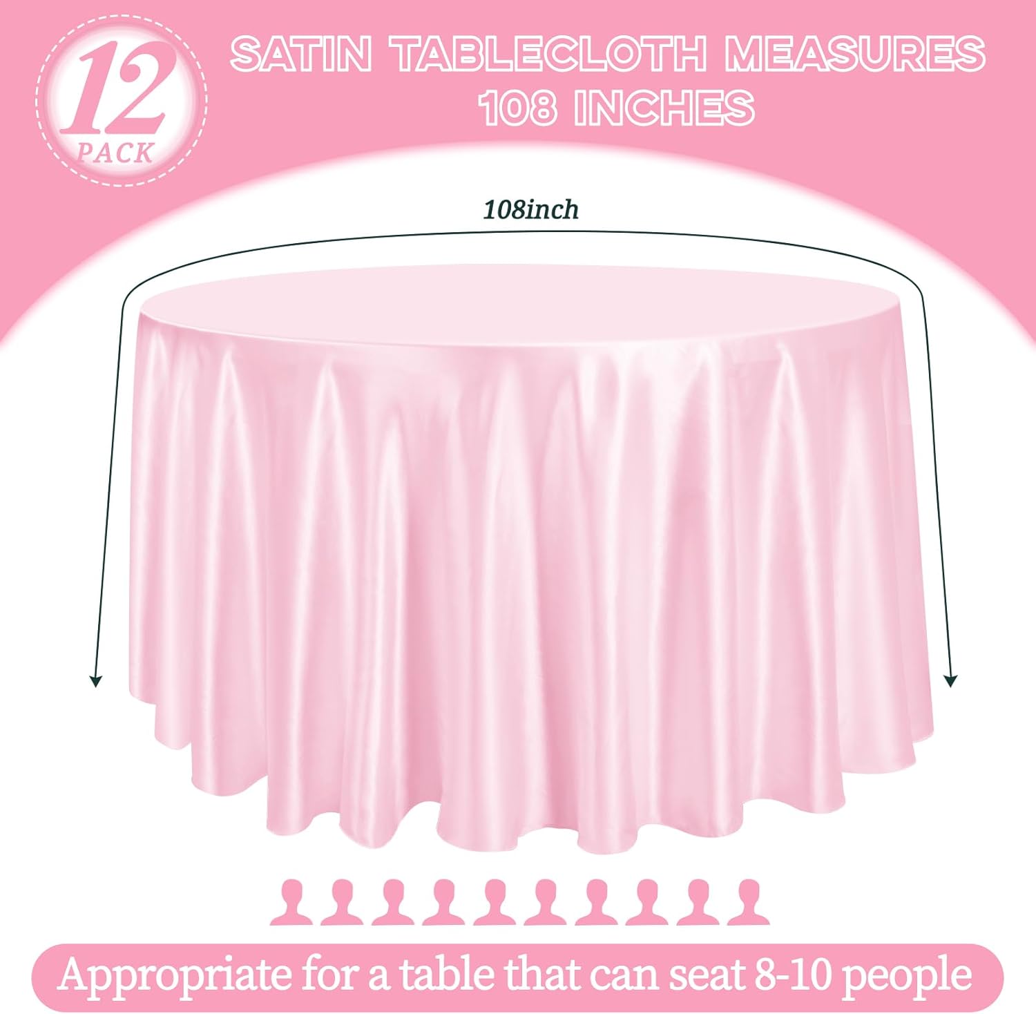• 【Round Satin Tablecloths】12 Pieces premium light pink satin round tablecloth. The size of silk satin table cover is 108 inches, large enough to decorate a table that can accommodate 8-10 persons. It is suitable for most household round tables and can meet your different needs. Sufficient quantities are sufficient for party decoration. The tablecloth size is usually larger than your table size. Please measure your table size before buying.