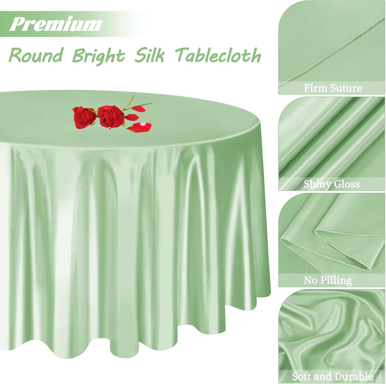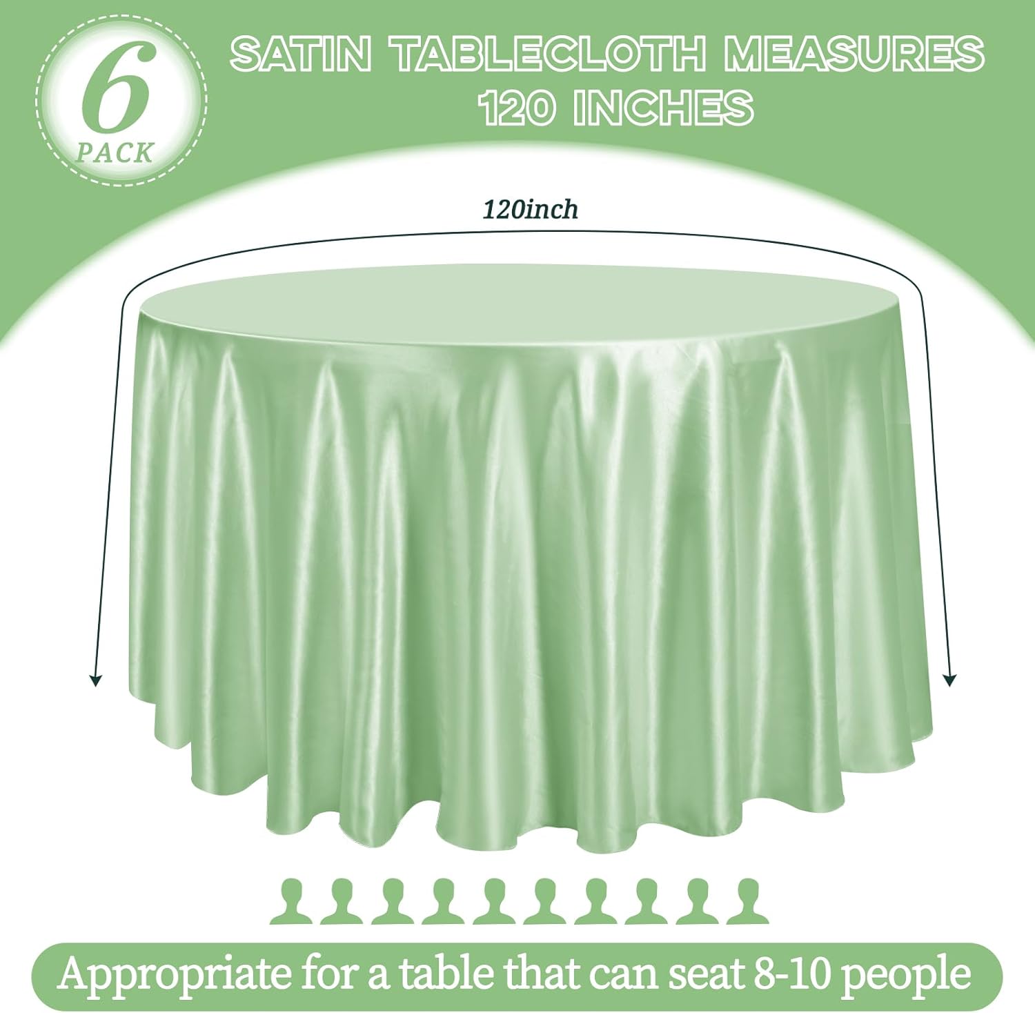 • 【Round Satin Tablecloths】6 Pieces premium sage green satin round tablecloth. The size of silk satin table cover is 120 inches, large enough to decorate a table that can accommodate 8-10 persons. It is suitable for most household round tables and can meet your different needs. Sufficient quantities are sufficient for party decoration. The tablecloth size is usually larger than your table size. Please measure your table size before buying.