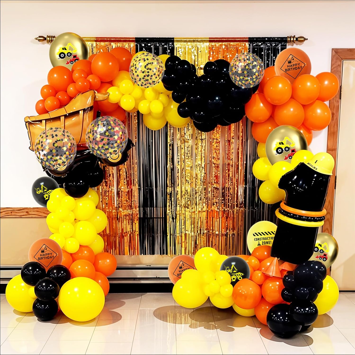 • 【Construction Party Decorations】This 35pcs 12-inch excavator balloon pack includes 7pcs gold construction vehicle design balloons, 7pcs yellow construction sign design balloons, 8pcs orange construction birthday design balloons, 8pcs black construction design balloons,5pcs black orange and yellow confetti balloons, and 1 roll white ribbon. Great for construction-themed parties, construction birthday party decorations, or excavator birthday decorations for little builders.