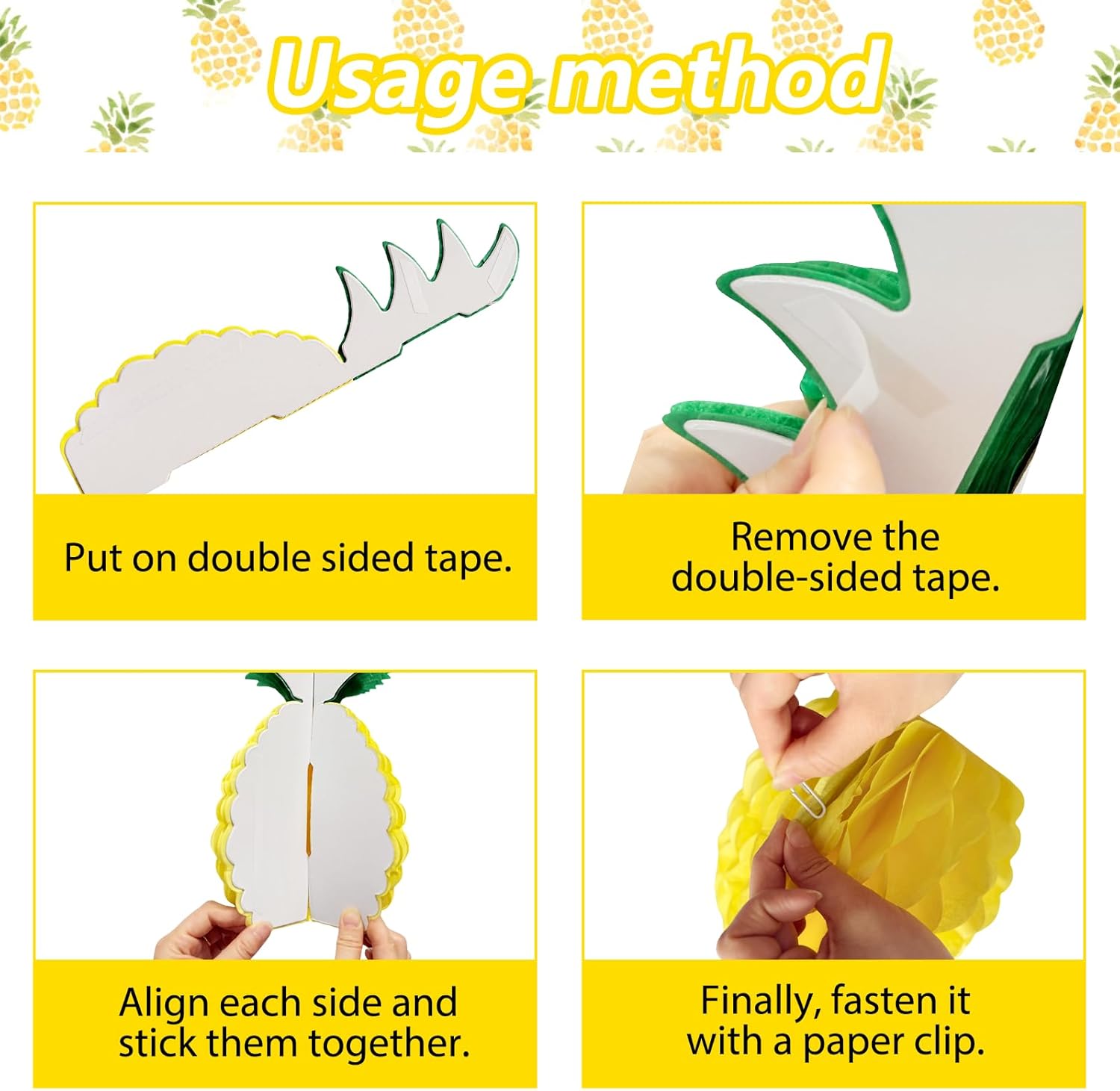 • 6 PACK 14 INCH PINEAPPLE HONEYCOMB DECORATIONS – This set includes 6 vibrant pineapple honeycomb centerpieces, each measuring 14 x 3.5 inches when fully opened. Made from colorful tissue paper with a bright 3D design, perfect for adding a fun tropical vibe to your party décor.