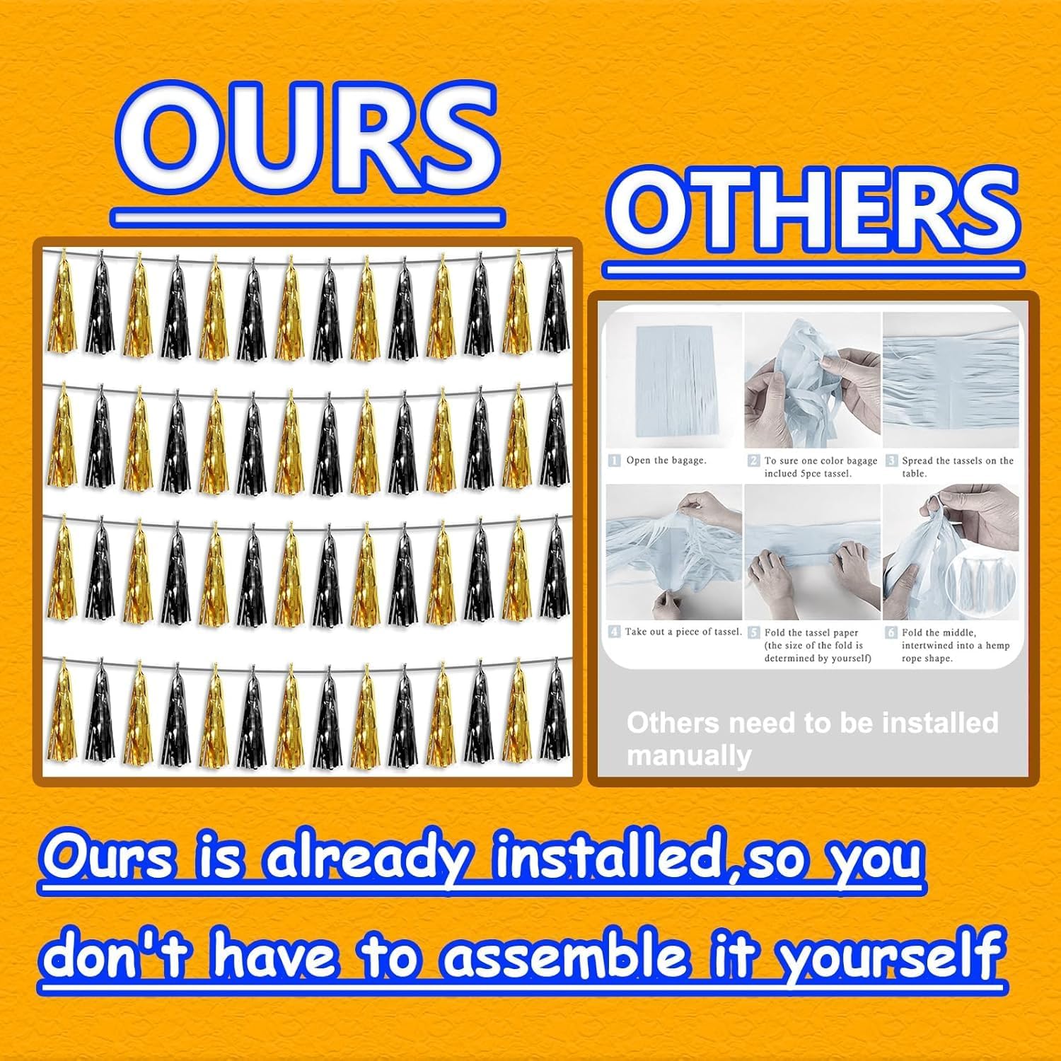 • 【Package Includes】The total length of the black gold birthday tassels banner is 40 feet, divided into 4 strips, each 10 feet long. Each banner contains 15 tassels, and each tassel measures 14 inches, for birthday decorations many occasions uitable for Patriotic display, Homecoming Float, Christmas Float, ecorative metal trailers, graduation floats etc
