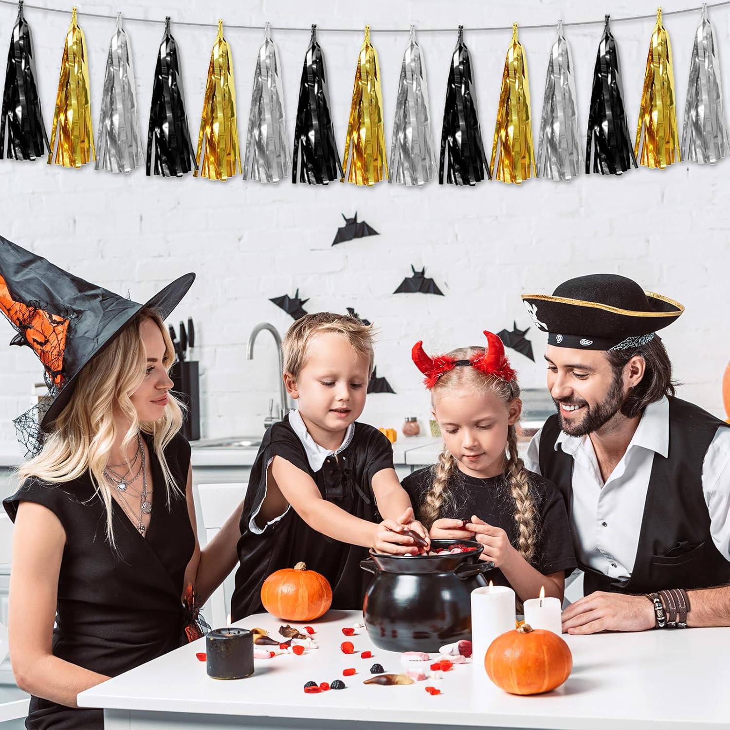 4P Black Gold Silver Foil Fringe Tassel Garland Banner Metallic Tinsel Streamers Wall Hanging Curtain Backdrop Banner for Parade Floats, 2025 Graduation Decorations,New Years Decorations, Father' Day