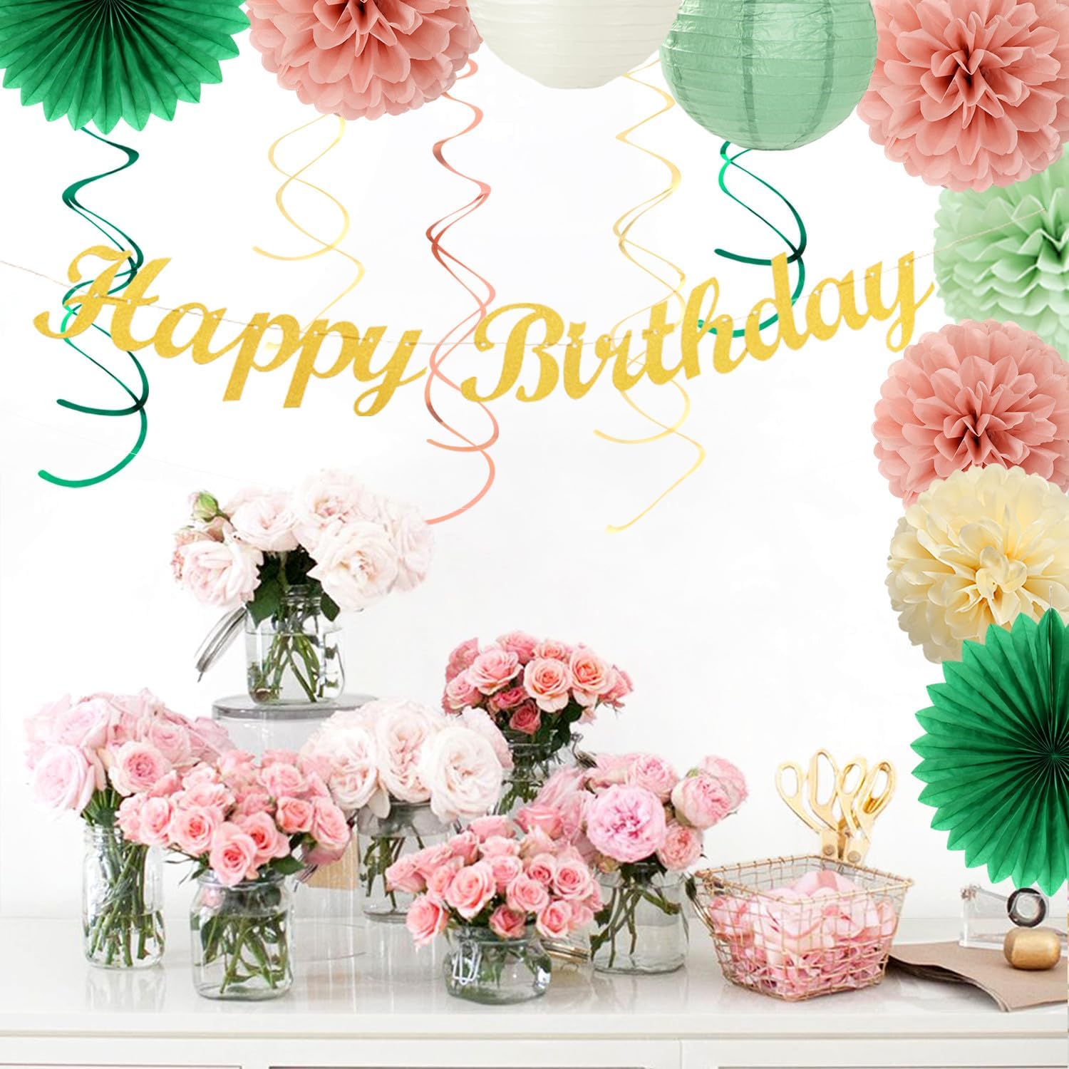 • Package Includes: This kits include 1pcs gold happy birthday banner, 1pcs circle dots paper banner, paper tassels party garland, 4pcs tissue pom poms, 2pcs paper lanterns, 2pcs paper flower fans, 6pcs paper swirls hanging streamers in olive sage dark green and beige colors, and different sizes