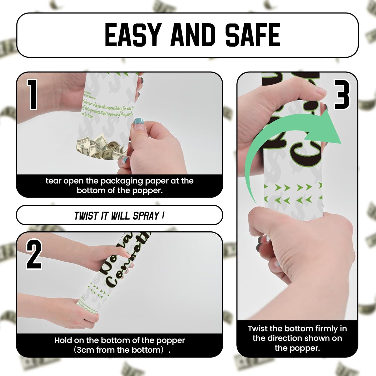 • Mini Money Confetti Poppers - Find confetti cannon hard to twist to pop?Maybe you got a wrong way to use confetti poppers. To avoid awkward silence in the beginning, please read the instructions and tear open the packaging paper at the bottom of the popper, then easy to twist it!