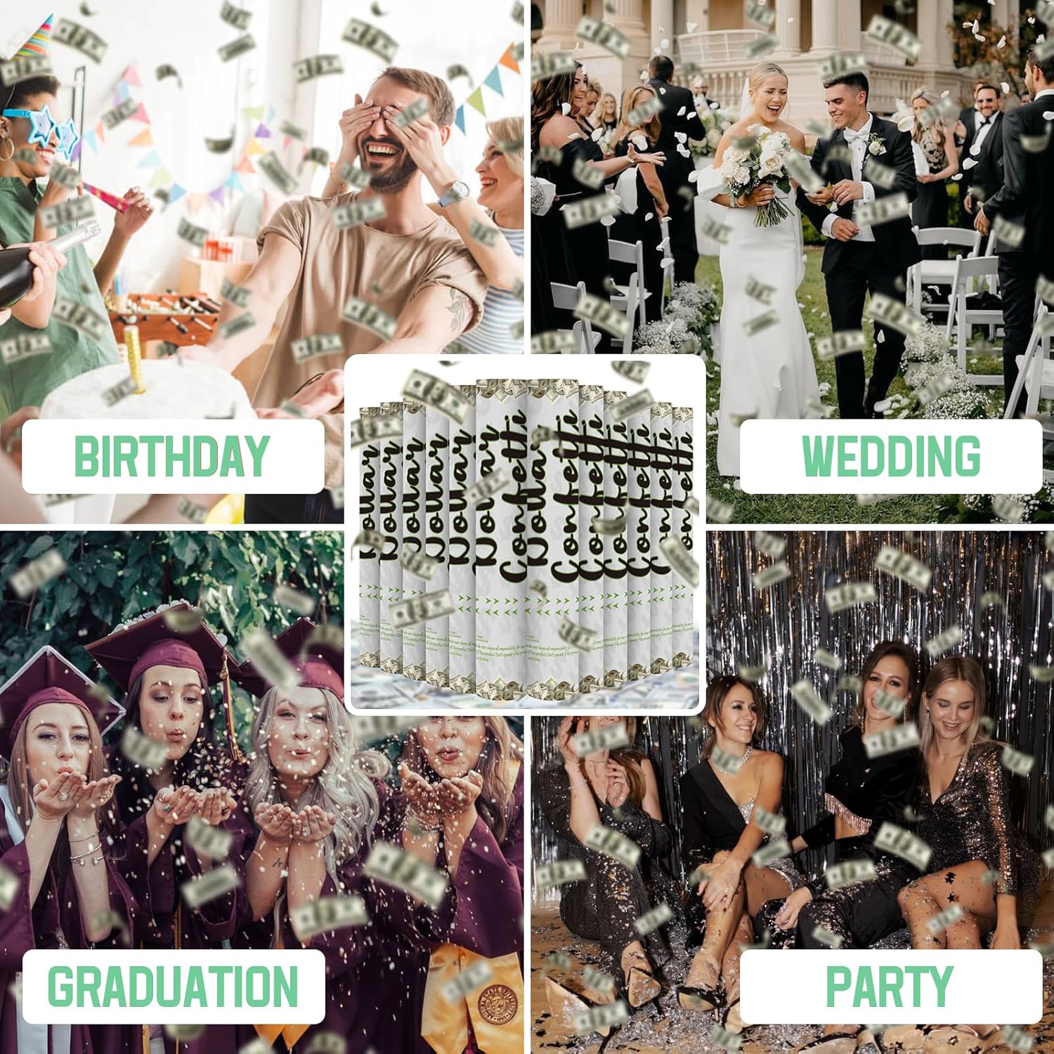 • 12 Pack Confetti Cannon - Each confetti cannon bulk includes 12 pack confetti poppers filled with mini 100 dollar bill confetti. Add surprise to your celebration with dollar confetti popper cannons. Perfect for creating a memorable highlight, these poppers will make your special moments shine bright and bring the party to life!