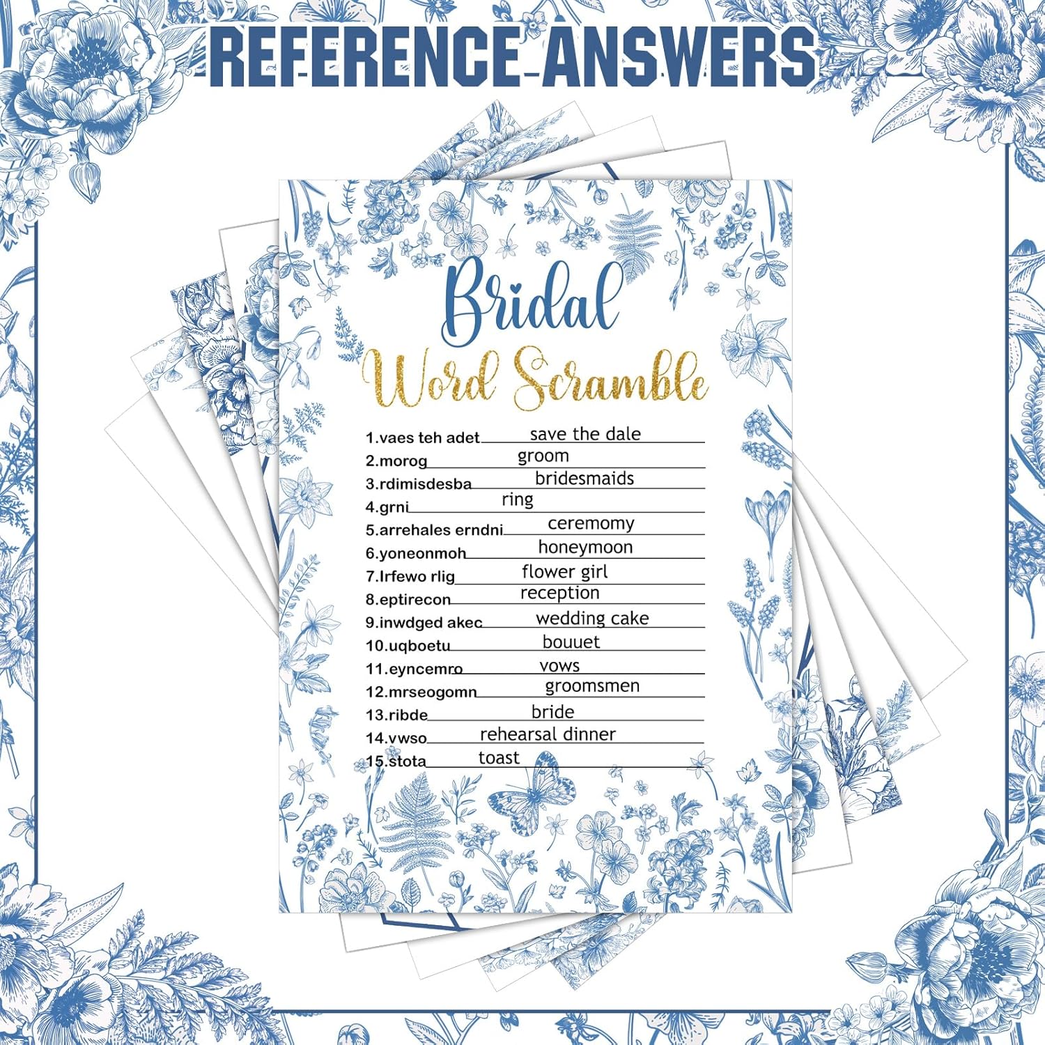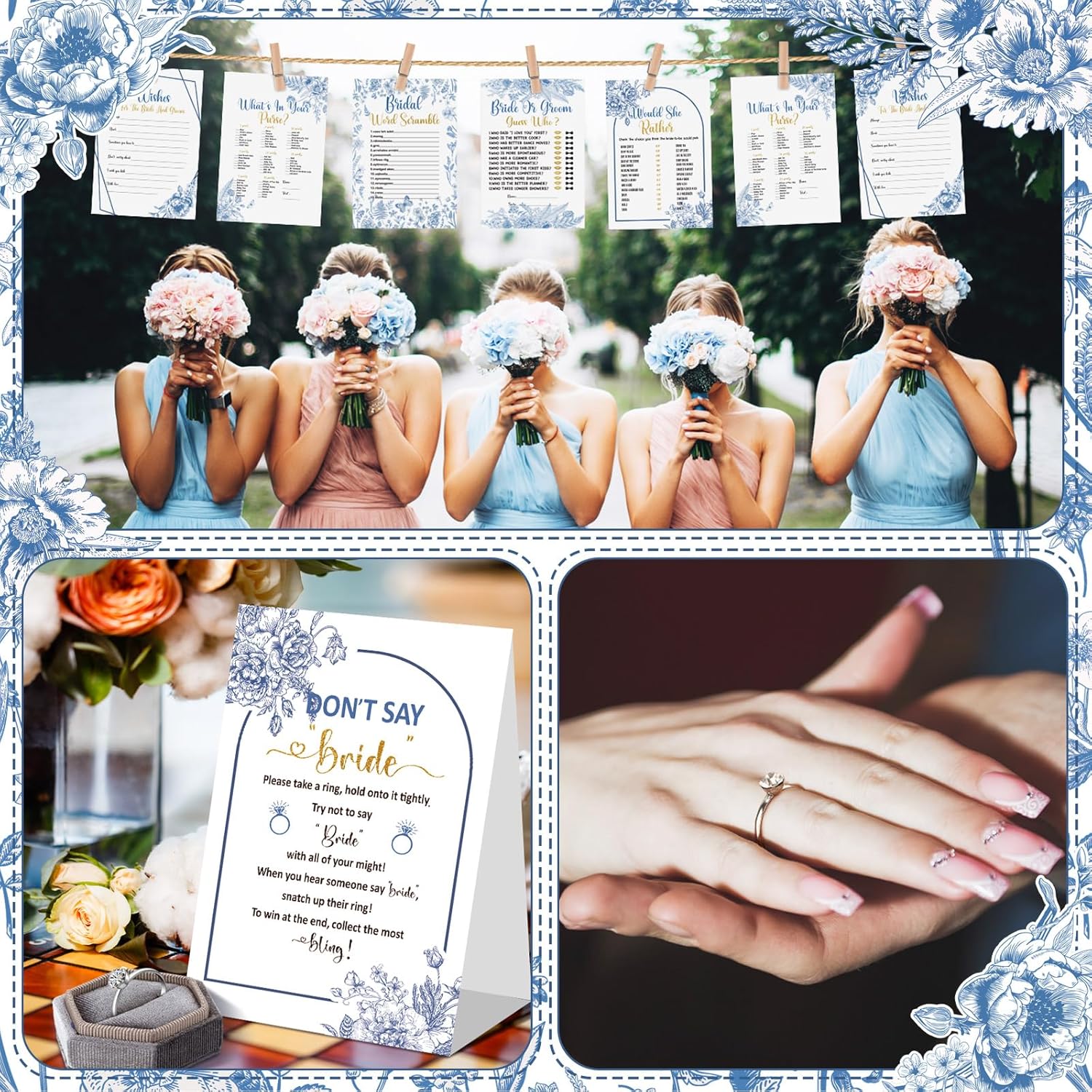 Estune 331 Pcs Bridal Shower Games Supplies, 5 Sets 250 Pcs Wedding Games Cards, 60 Pcs Rings, 20 Pcs Pencils (Blue Floral Style)