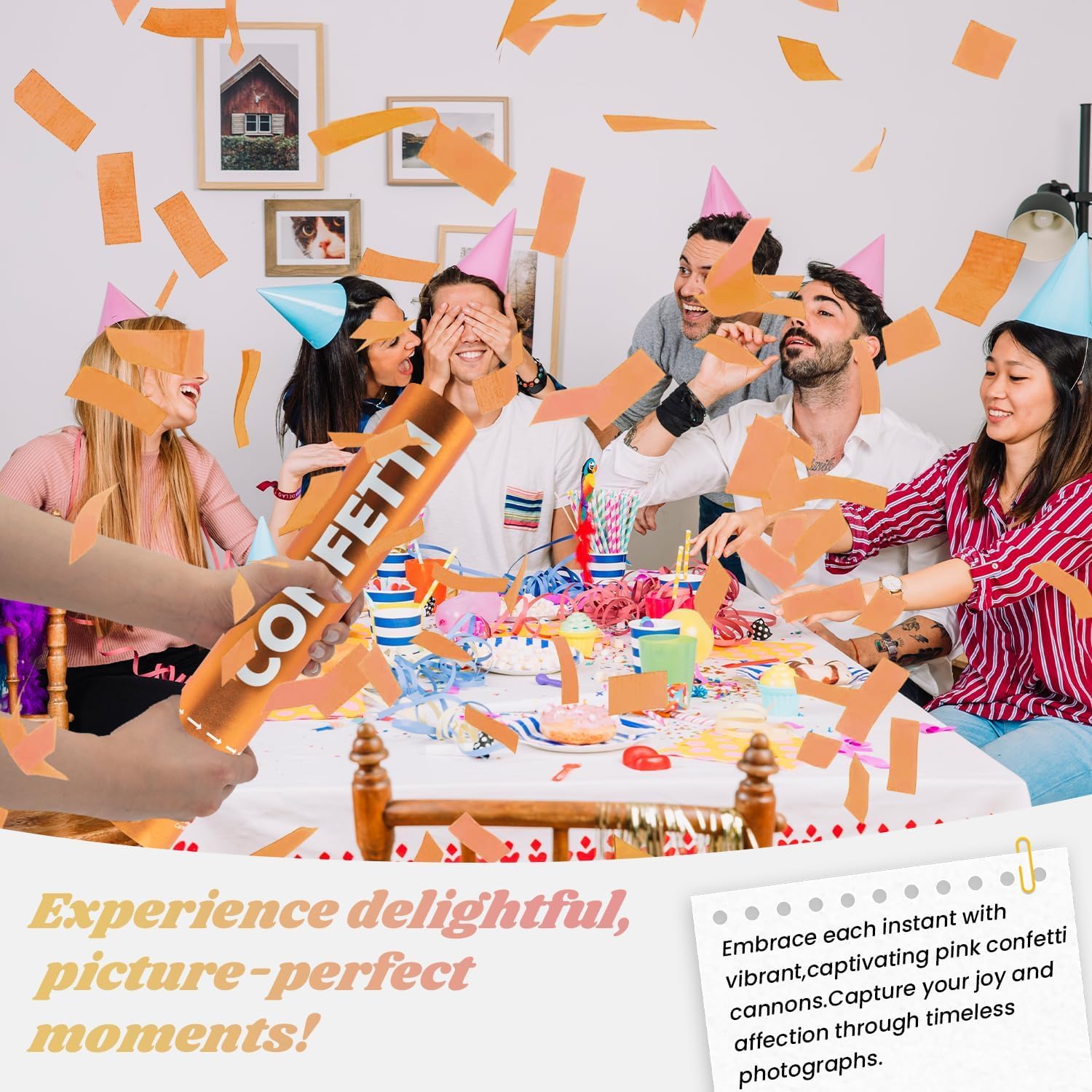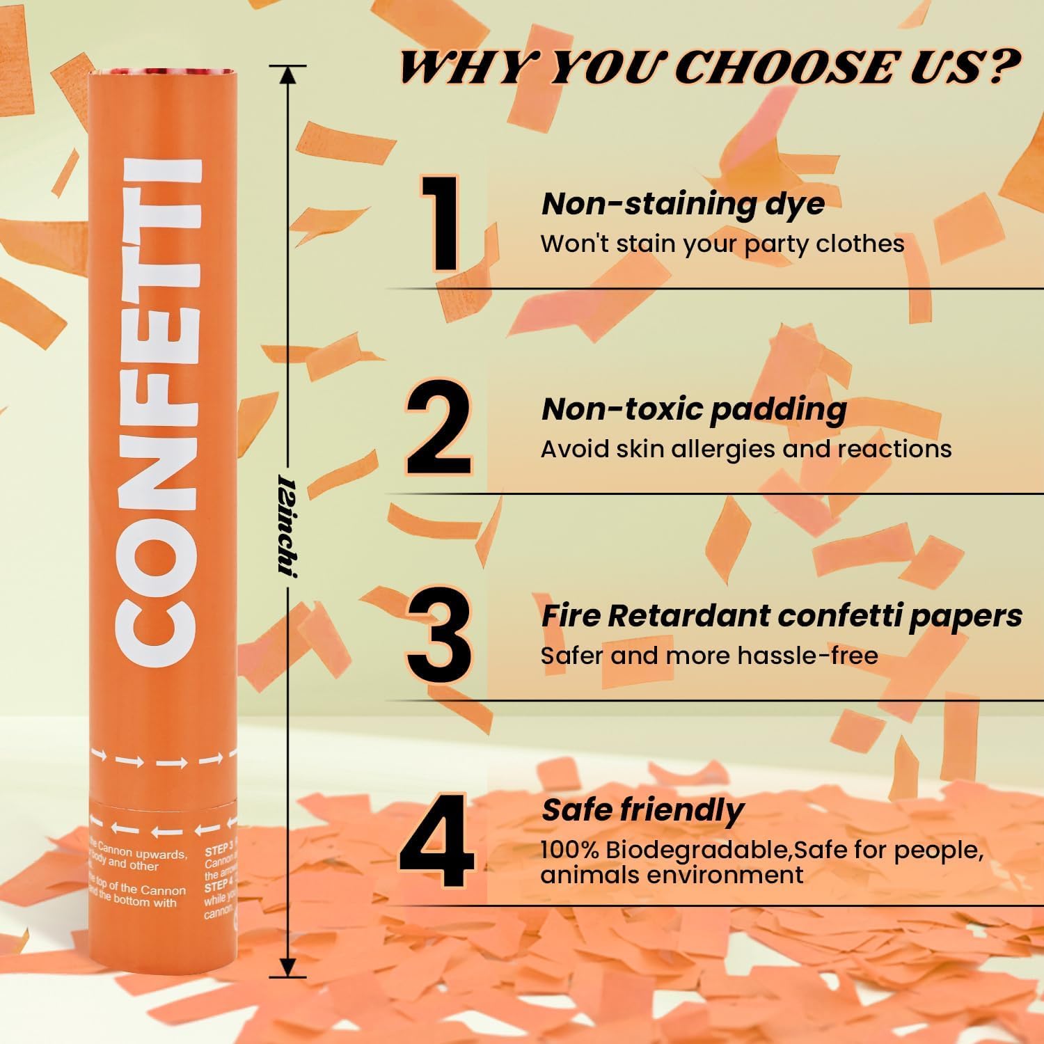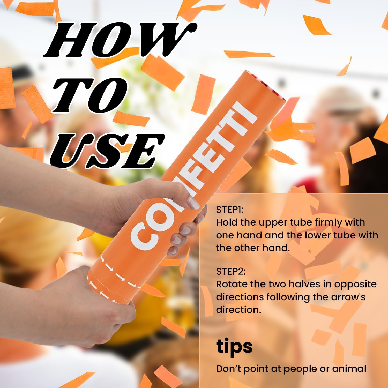 • 【Good Quality Party Poppers Cannon】12inch confetti poppers are full of high quality Orange biodegradable confetti, air powered party poppers can shoot 10 to 15 feet in the air like a Orange butterfly launch your celebration unforgettable memories! Everyone likes popping poppers! Twist the bottom of the party poppers and watch the confetti blasters out on you and your loved ones and get a photoshoots.