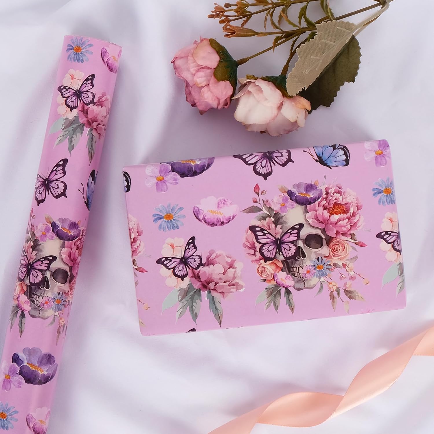 Aimyoo Gothic Wrapping Paper Roll, 17 Inch X 33 Feet Skull Floral Butterfly Design Gift Wrap Paper for Mother's Day, Birthday Bridal Shower