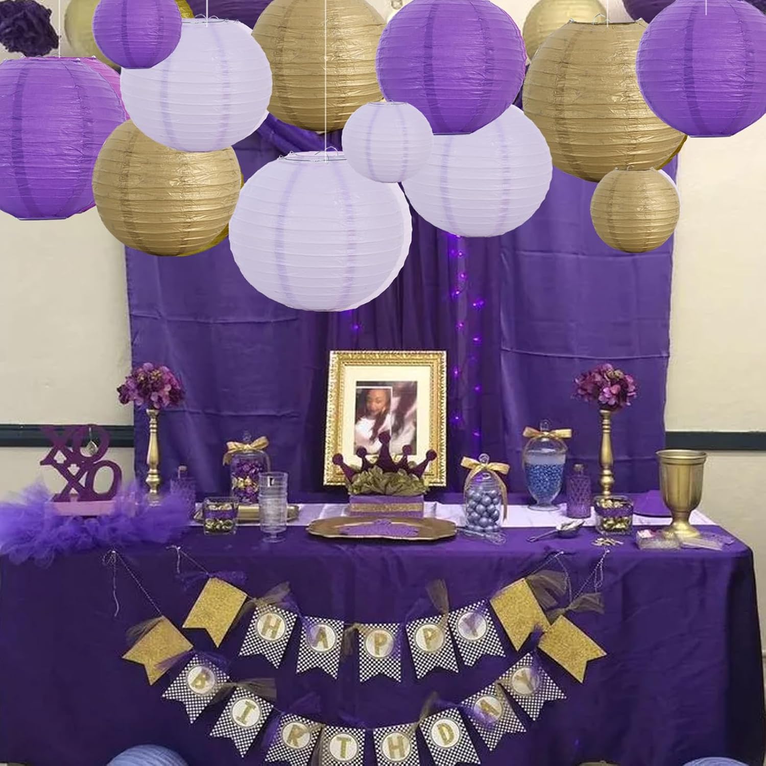 BEISHIDA 16 Pcs Purple Gold Paper Lanterns,Hanging Decorative Chinese Japanese Round Paper Lantern Lamp for Graduation Bachelorette Birthday Party Decoration