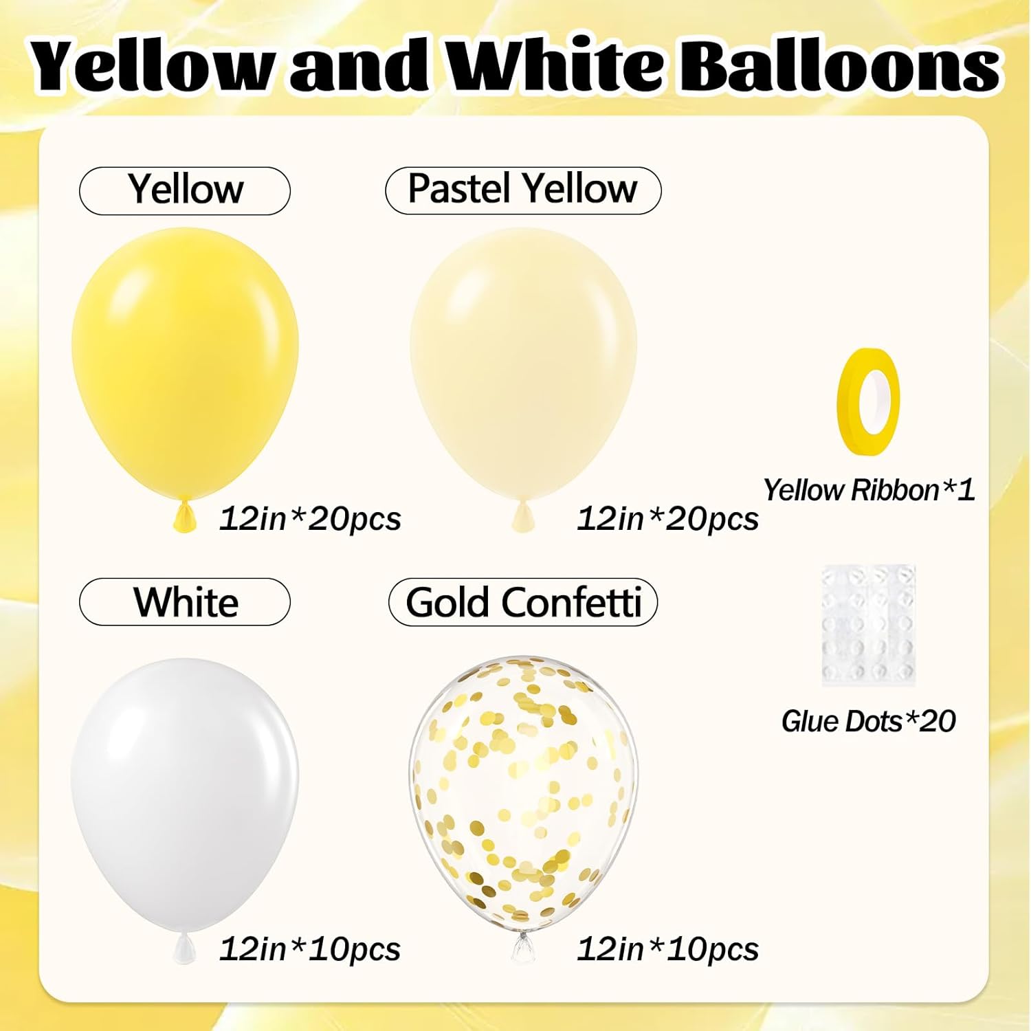 • Package Include: The yellow and white balloons include 12inch yellow balloonsx20, 12inch pastel yellow balloonsx20, 12inch white balloonsx10, 12inch gold confetti balloonsx10, glue dotsx20, yellow ribbonx1