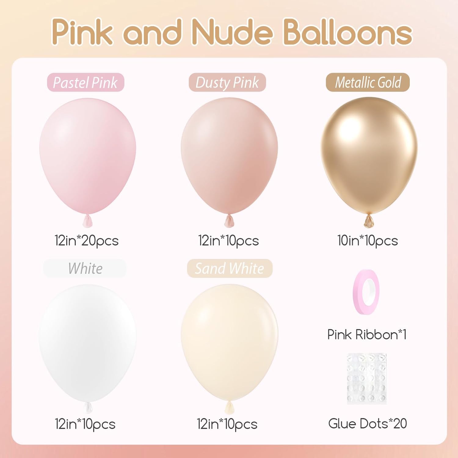 • What You Will Get: The package includes 12inch dusty pink balloonsx10, 12inch pastel pink balloonsx20, 12inch sand white balloonsx10, 12inch white balloonsx10, 10inch metallic gold balloonsx10, glue dotsx20, pink ribbonx1