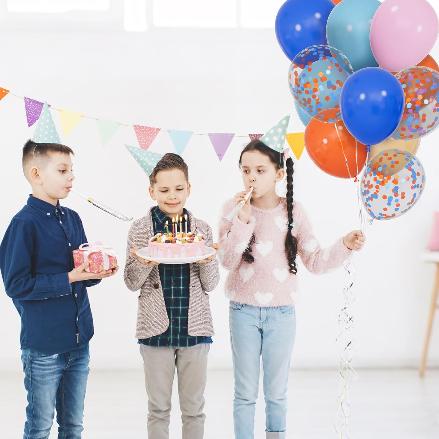 • Blue birthday decorations Package content: 68 pieces of 12 inch latex balloons (15 dark blue balloons, 15 light blue balloons, 15 skin color balloons, 15 orange balloons, 8 blue and orange mixed sequin balloons, 2 rolls of ribbon)
