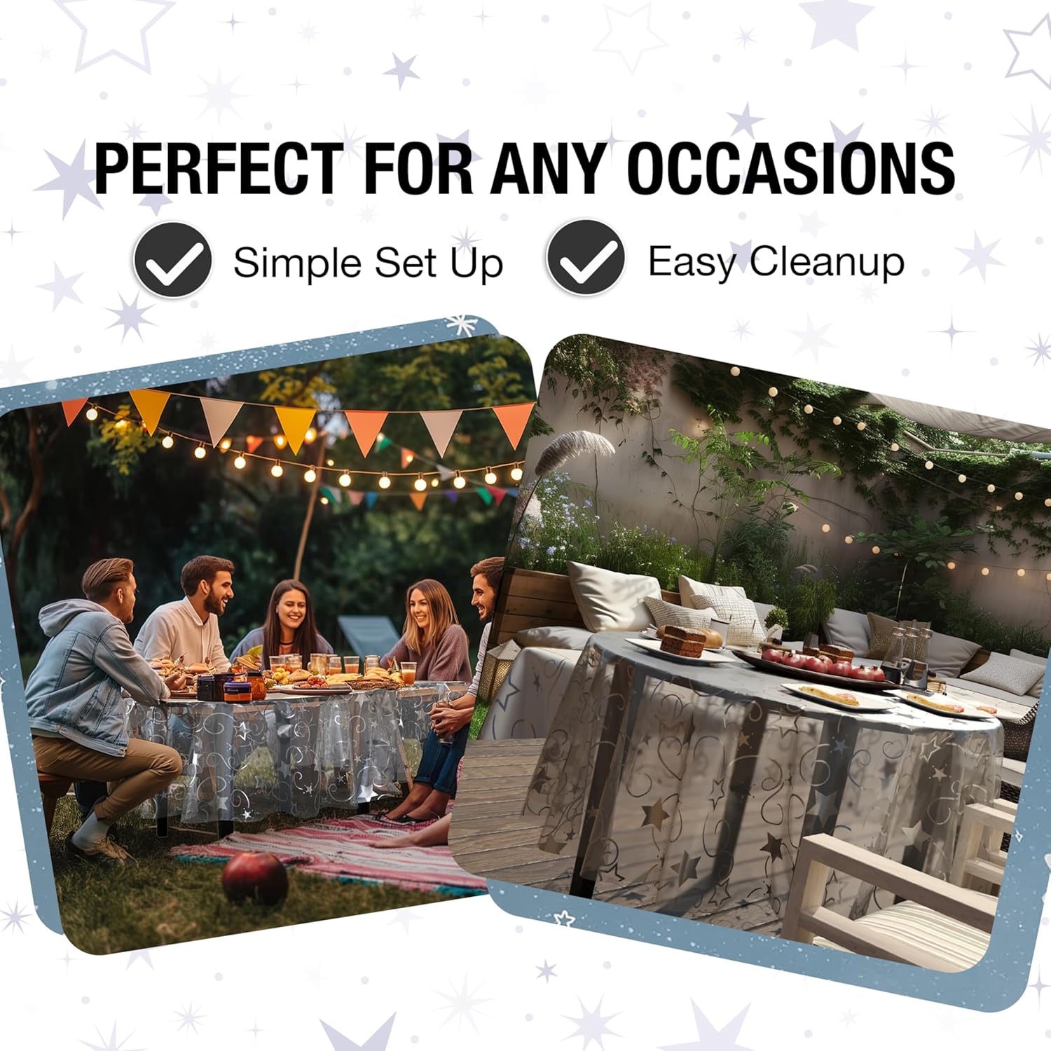 • Quality: Made from premium Tablecloth Plastic, these round Tablecloths Plastic are waterproof, durable, and spill-resistant. Use these Plastic Table Covers for worry-free protection. These Silver Star table cloths for parties are great for indoor or outdoor events, ensuring your tables stay mess-free and stylish.