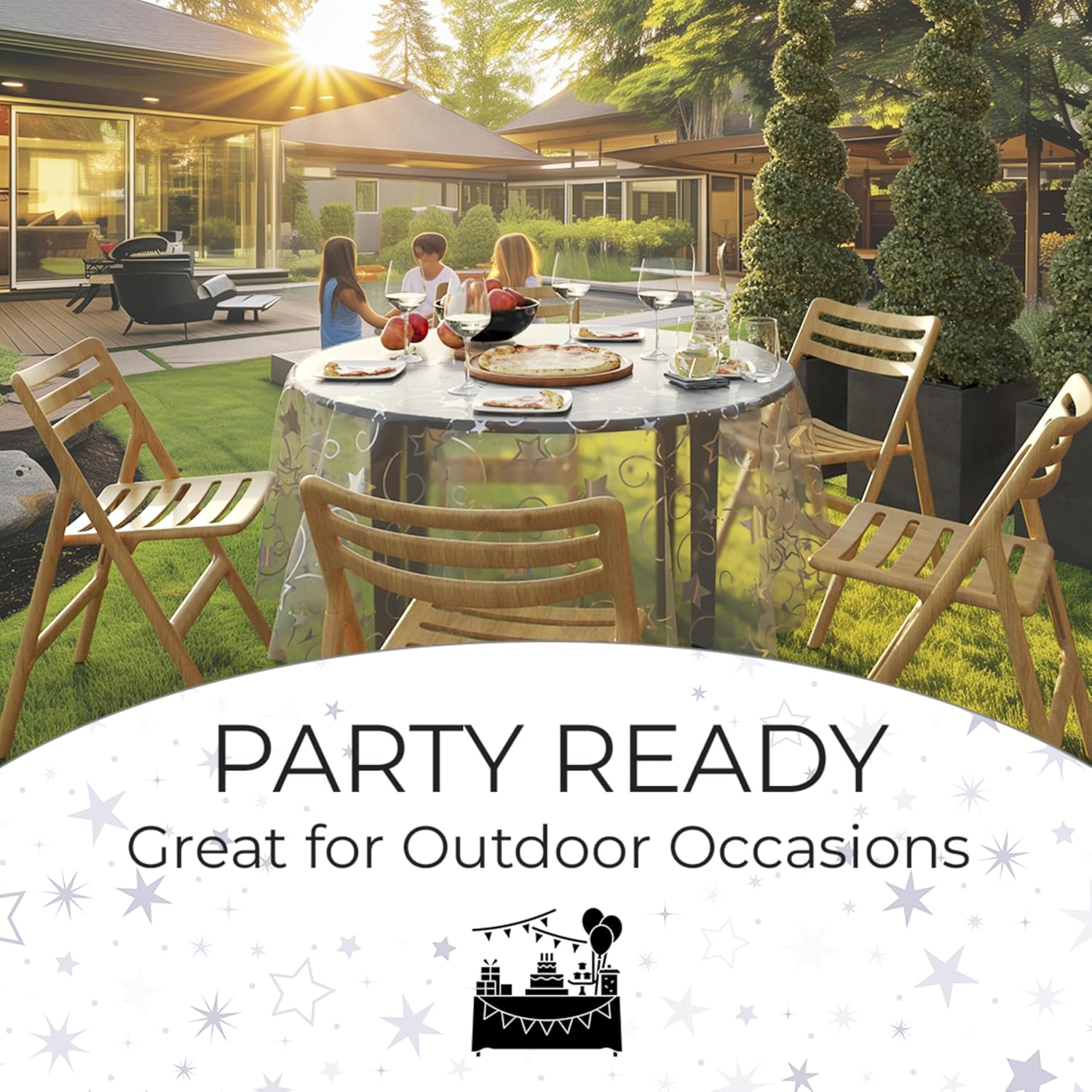 • Includes: This 12-pack of Silver Star on clear back Tablecloths comes with Disposable round Tablecloths measuring 84". These round Table Covers are perfect tablecloths for round tables, offering a stylish Silver Star Table cloths design for any celebration, keeping your tables clean and protected.