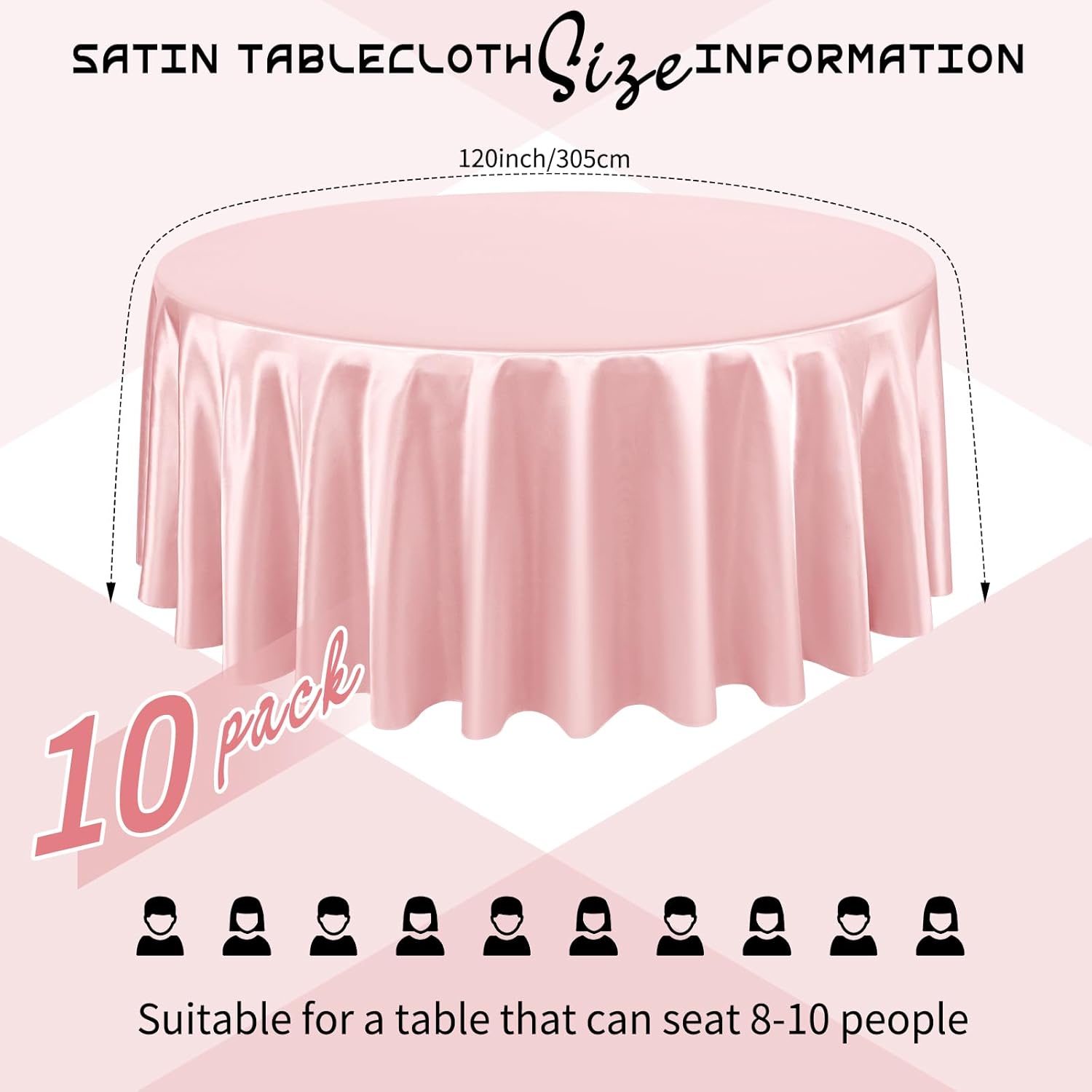 • Package List: You will get 10 packs rose gold satin tablecloth.The size of satin table covers are 120 inch/305 cm, which is large enough to decorate a table that can accommodate 10-12 persons.The tablecloth size is usually larger than your table size. Please measure your table size before buying.