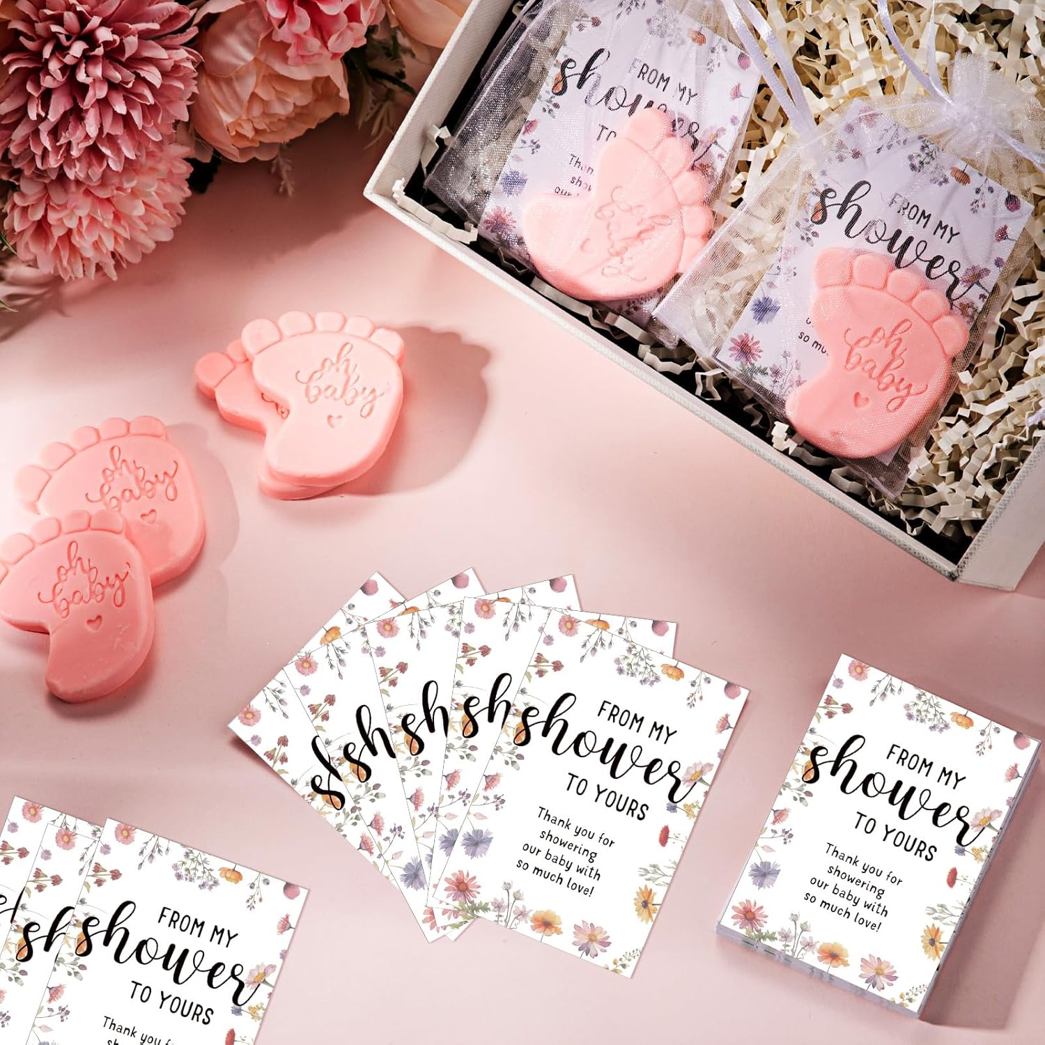 • Baby Shower Soaps: these baby shower soaps are made from natural vegetable oil soap base and glycerin, ensuring skin friendly and smooth usage; The package is a complete set containing 50 handmade soaps, 50 thank you cards, and 50 organza bags, making it a comprehensive and excellent gift choice for your guests