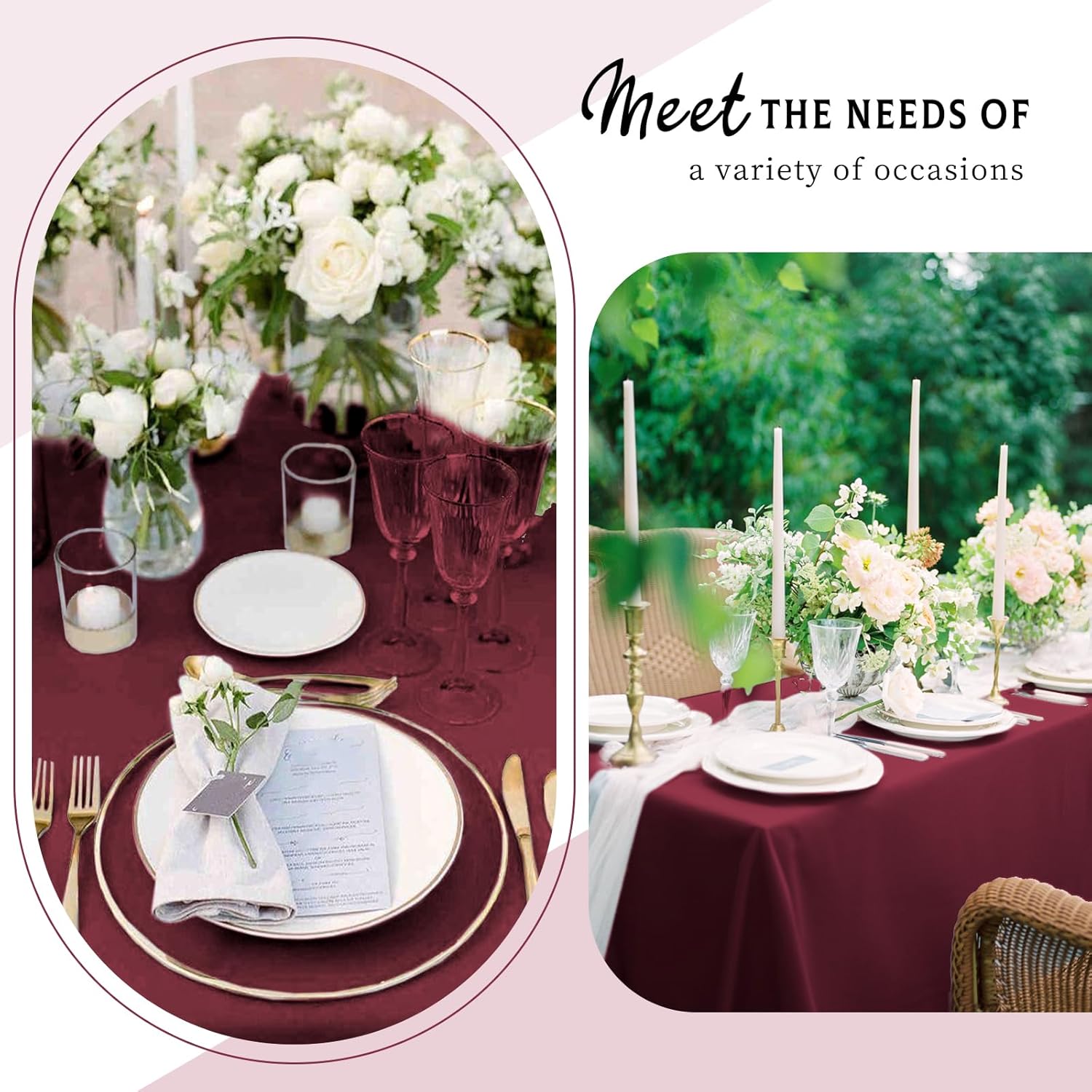 • Package List: You will get 10 packs burgundy satin tablecloth.The size of satin table covers are 57x108 inch/145x275 cm, which is large enough to decorate a table that can accommodate 10-12 persons.The tablecloth size is usually larger than your table size. Please measure your table size before buying.
