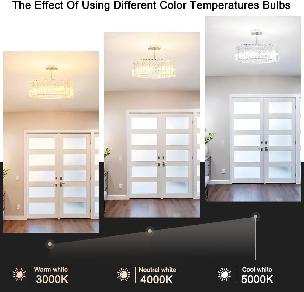 • 【Semi Flush Mount Ceiling Light Design】The ceiling light fixture features unique clear crystal shade and modern style chrome metal base. The open-bottom design delivers bright even illumination and makes it easy to replace the light bulb, makes this modern crystal chandelier simple and luxurious yet sophistication