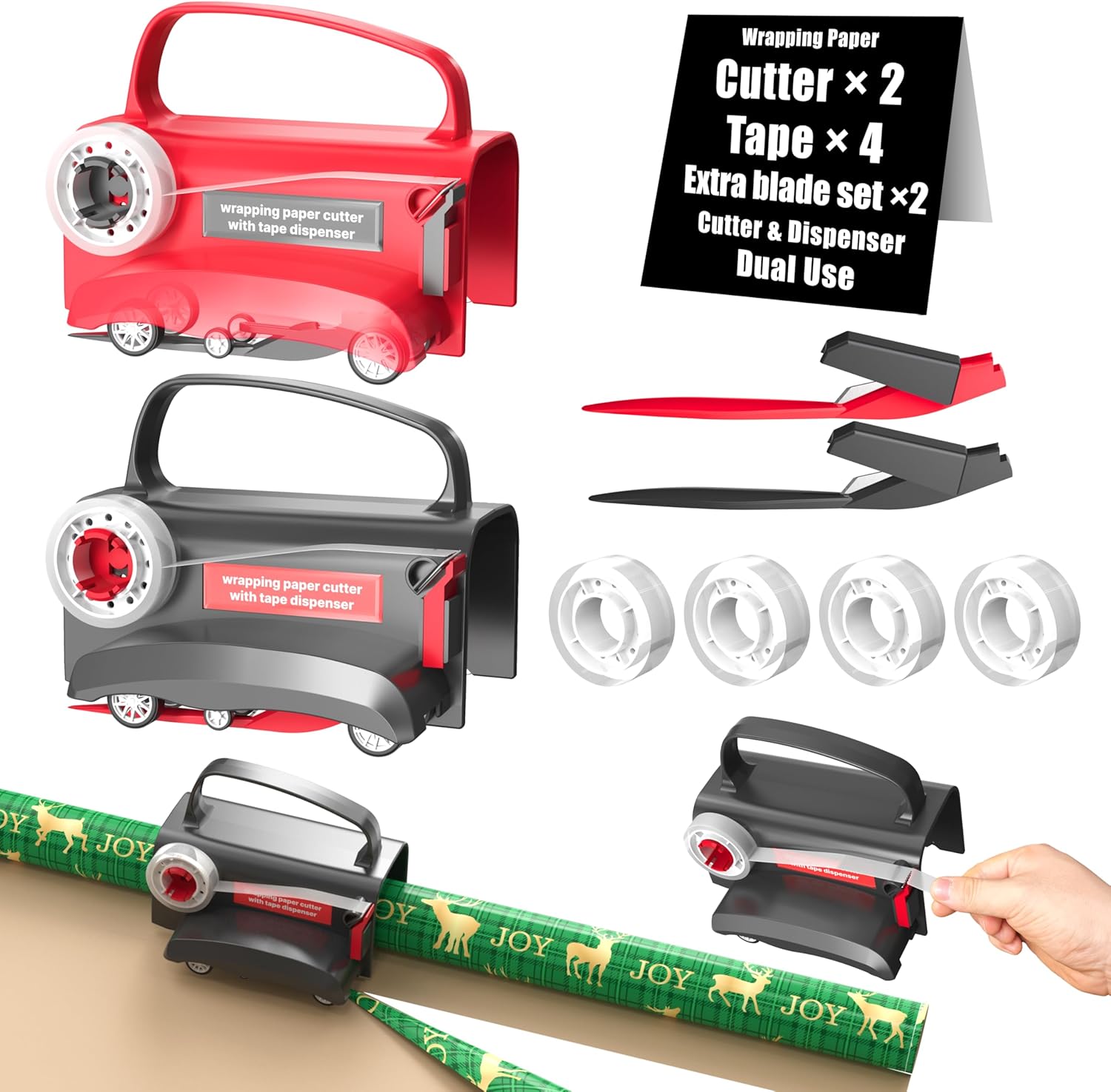 • Dual Function Cutter & Tape Dispenser Revolutionize gift wrap paper wheel cutter sliding! Effortlessly cut wrapping paper rolls and dispense clear tape. Includes 2 cutters, 4 transparent tape refills, and 2 capped blades. Roller-glide tech enables smooth cuts for Christmas gifts and birthdays. Supplies support ~1,000 boxes – ideal for gift wrap storage at home or shops.