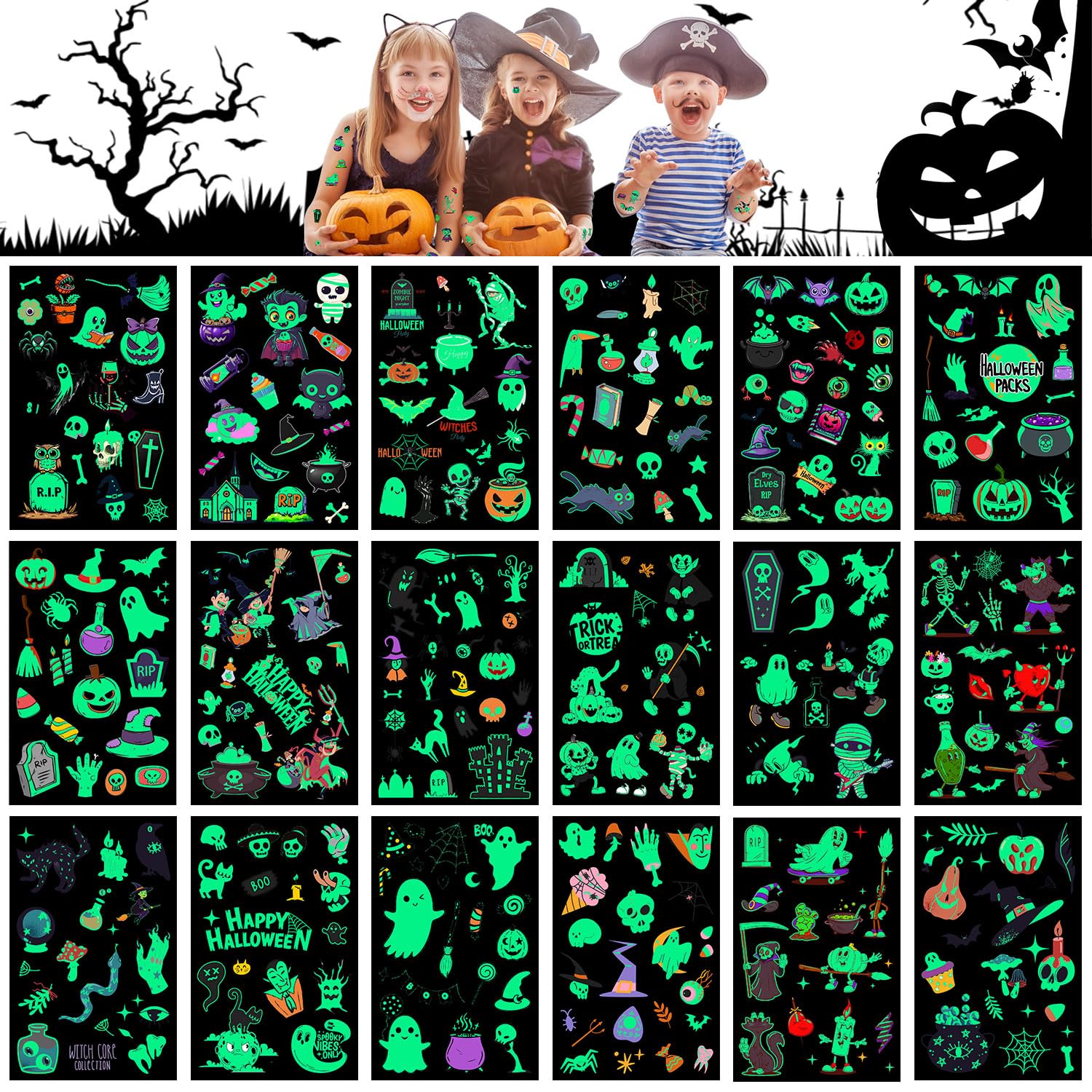 LOMIMOS 320PCS Glow in The Dark Halloween Temporary Tattoos for Kids, Waterproof Scary Removable Face & Body Stickers for Treat or Trick Bag Stuffers Party Favors Carnival Prizes Bulk (16 Sheets)