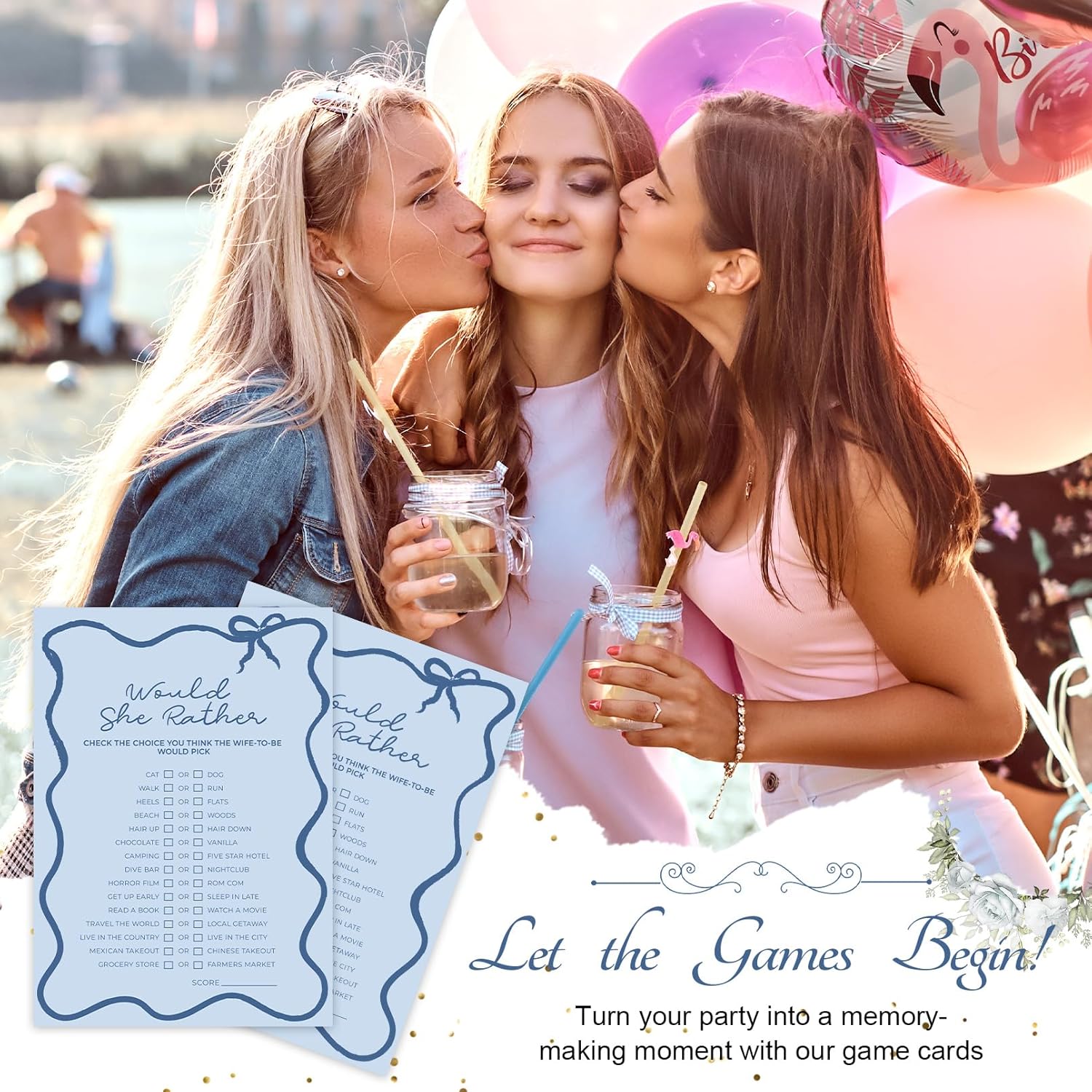 DEEKA 30 PCS Bridal Shower Games Card for 30 Guests Blue Wavy Border Ribbon Bow Funny Wedding Bachelorette Party Games for Reception (Would She Rather)