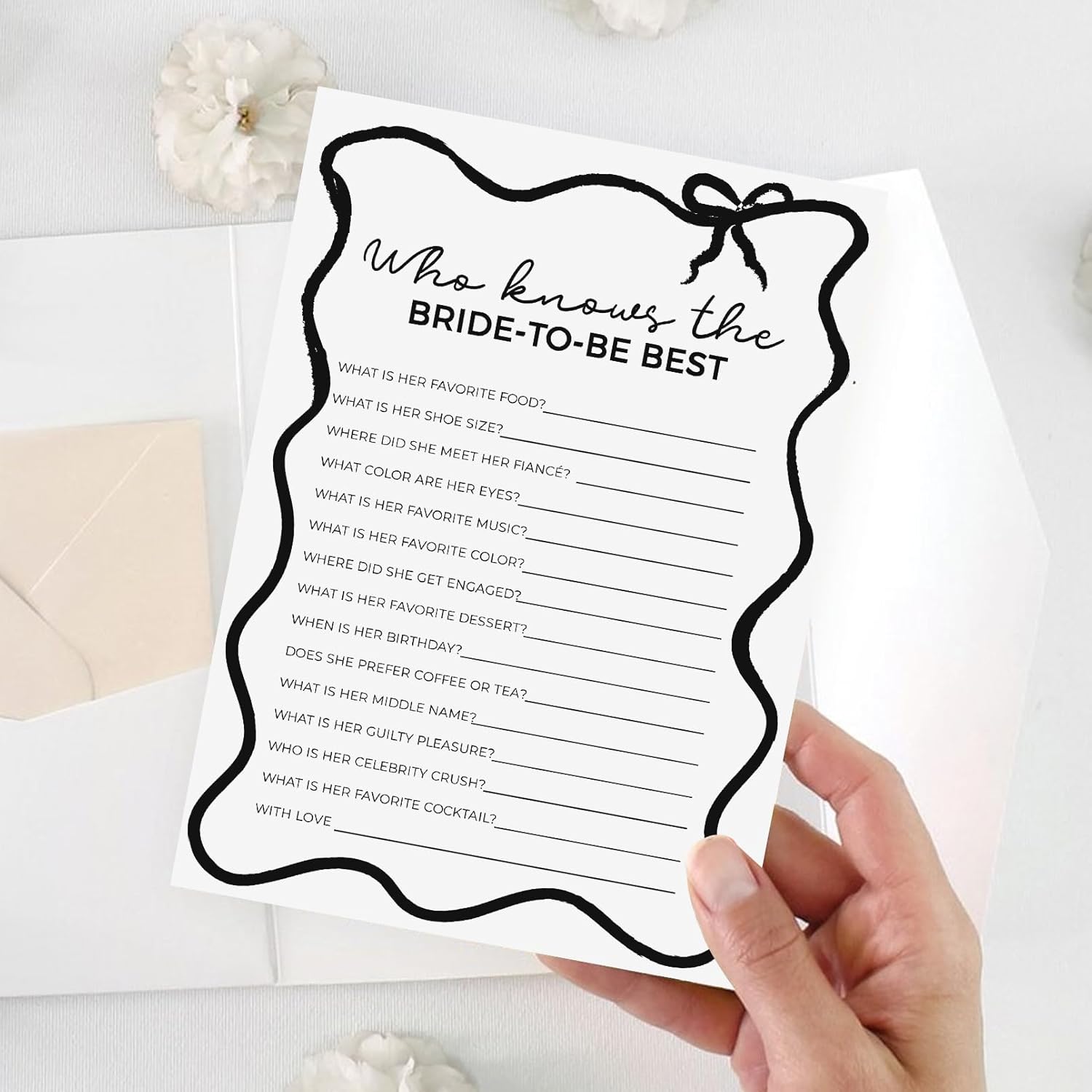 • ON-TREND DESIGN – These bridal shower games cards feature a stylish hand-drawn wavy border and a dainty bow accent, capturing the latest aesthetic trends.