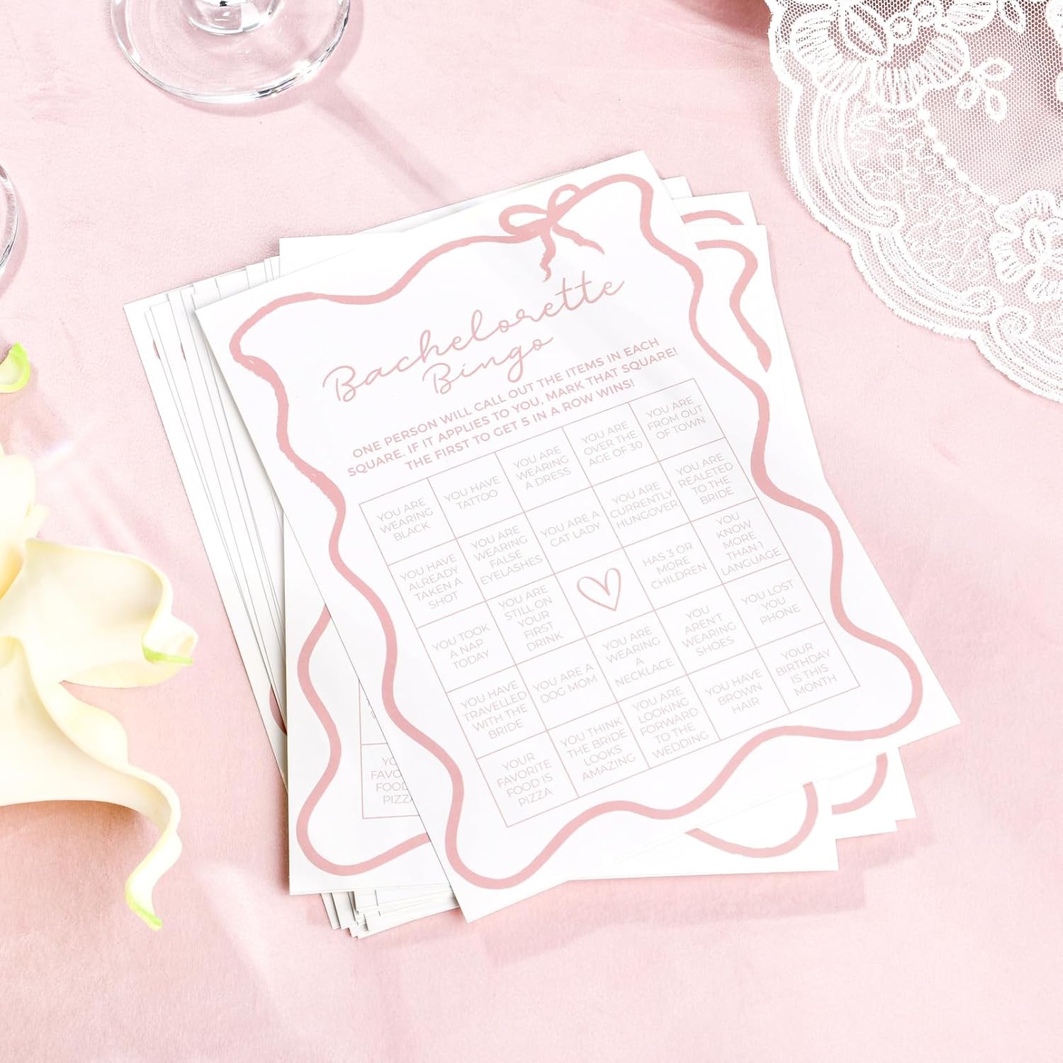 DEEKA 30 PCS Bridal Shower Games Card for 30 Guests White Pink Wavy Border Ribbon Bow Funny Wedding Bachelorette Party Games for Reception (Bachelorette Bingo)