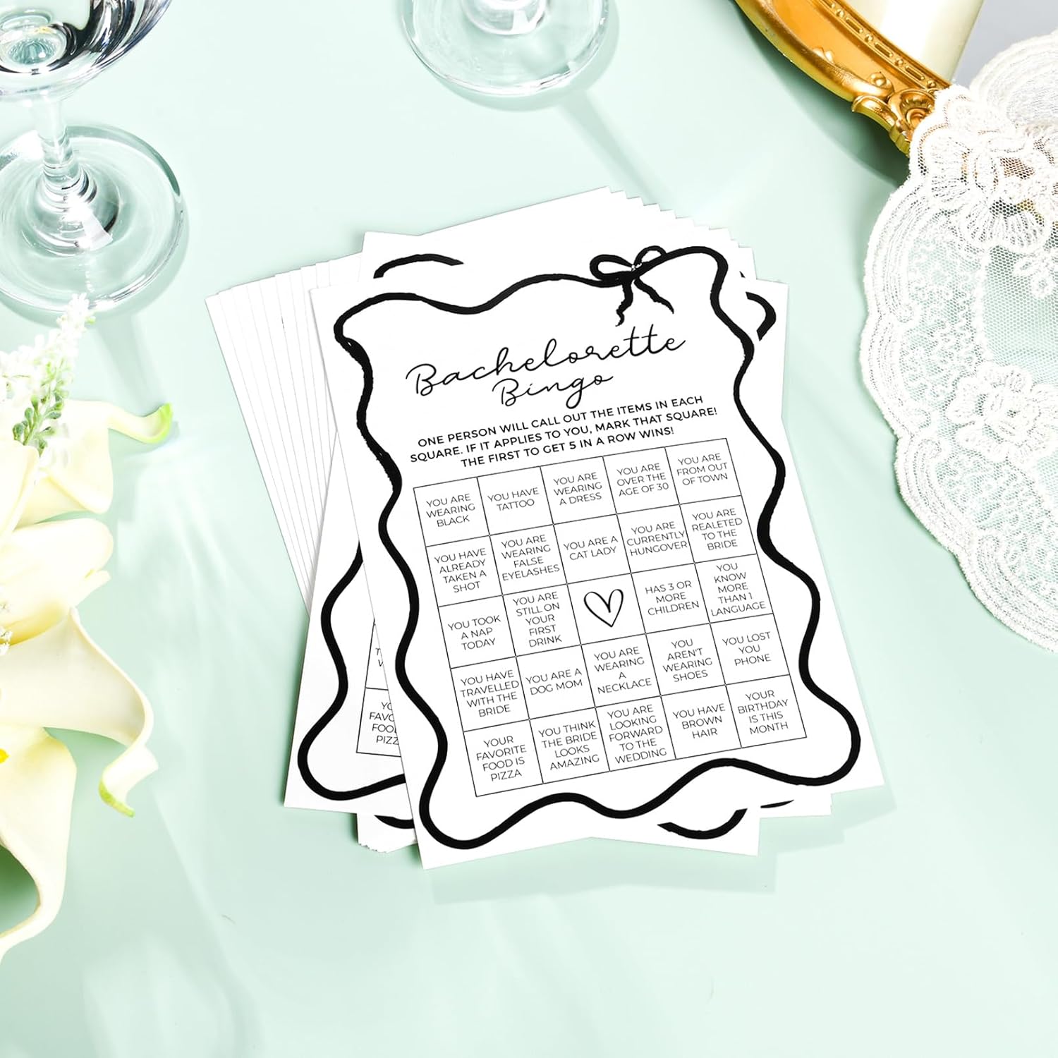 • ON-TREND DESIGN – These bridal shower games cards feature a stylish hand-drawn wavy border and a dainty bow accent, capturing the latest aesthetic trends.