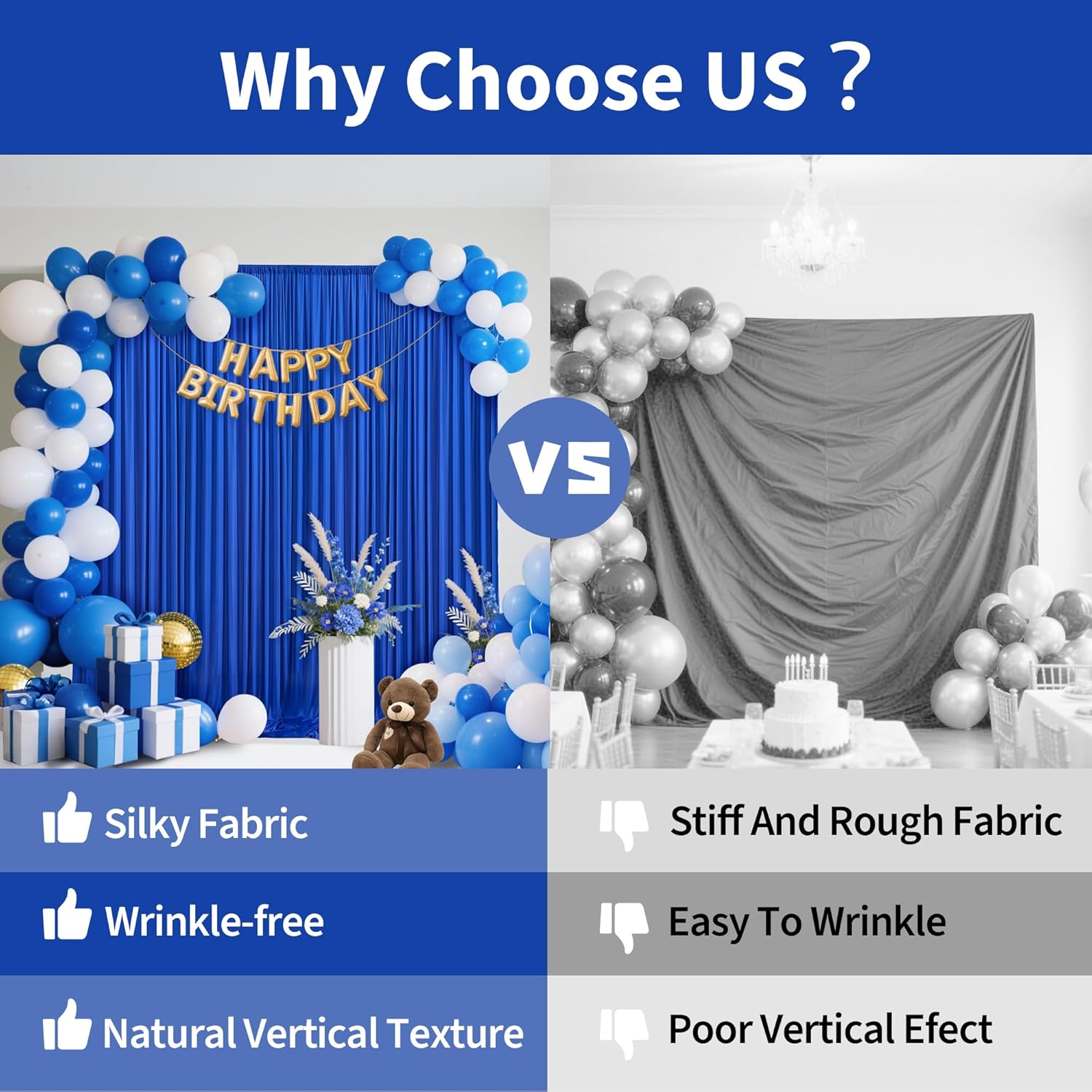 • Material: Backdrop curtains is made of high-quality polyester fabric, which has a soft texture, natural sagging, and is not easy to wrinkle. It can be tightened or stretched to determine the desired background width, perfectly decorating event or photo backgrounds