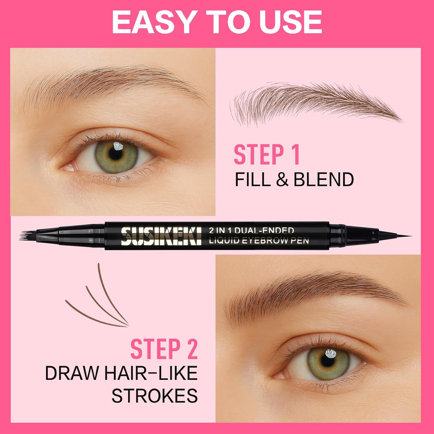 • 2 IN 1 BROW PEN -This innovative liquid eyebrow pen features a dual-ended design that combines two pro-grade applicators in one sleek tool. One end is equipped with a brow-fection square angled brush, perfect for creating natural-looking hair strokes and filling in sparse areas. The other end features a super-fine detail brush tip for defining edges, shaping arches, and adding micro-precision detailsβ€”giving you total control over your brow style, from natural to bold.