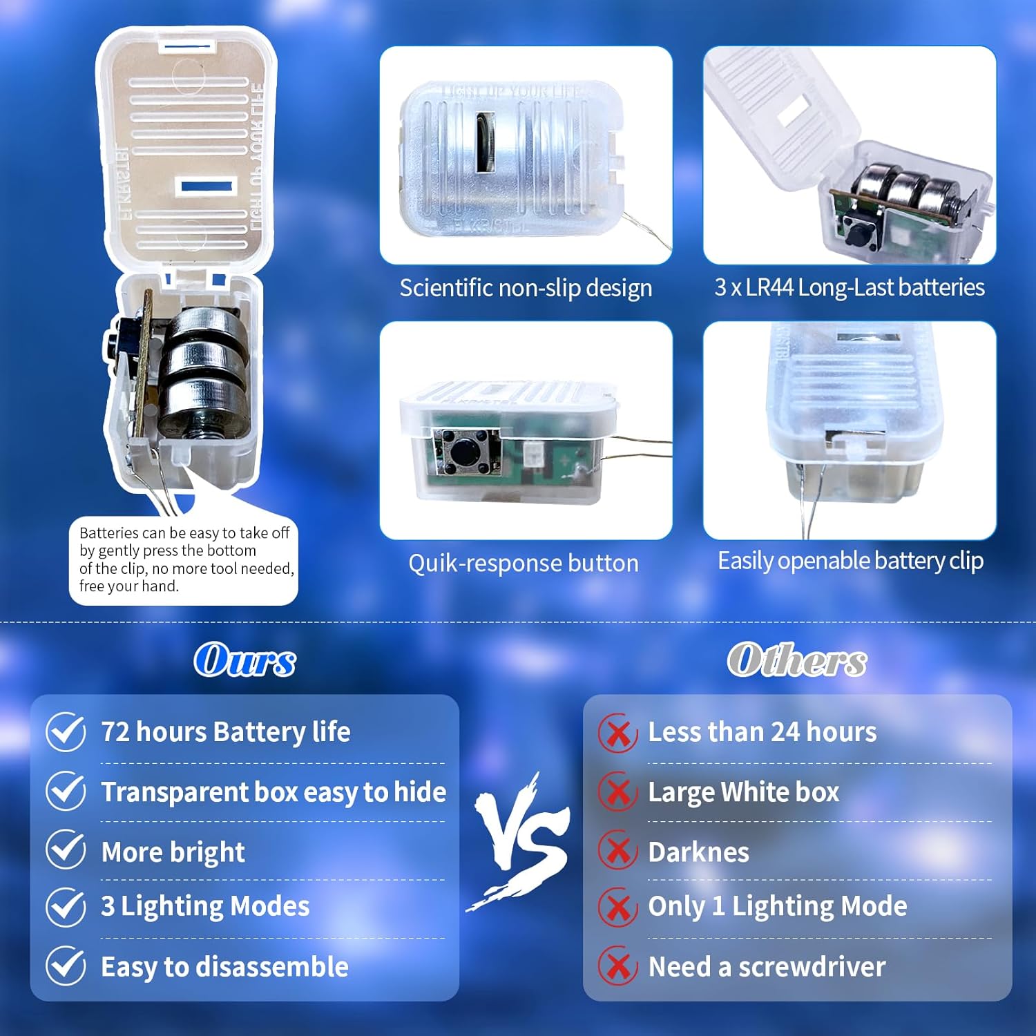 • PREMIUM QUALITY AND LONG LAST LIFE: 100 pack in a box, each twinkle lights made of high quality durable 7 feet long flexible silver wire, and 20 energy-efficient mini led fairy lights, 4 inch distance between each led moon lights. This fairy lights battery operated by 3 x LR44 batteries (included), which can provide 101 hours life. This Christmas lights is perfect for both everyday decorations as well as holiday decor (Batteries need to be replaced when the string get dims)